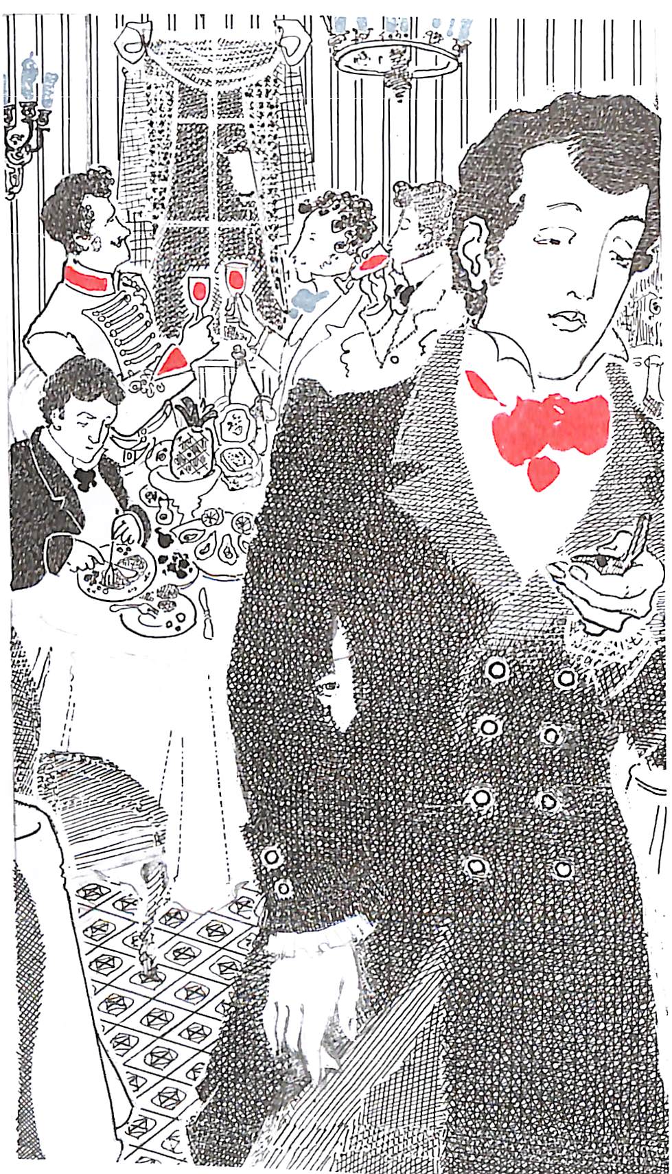 2) Акцент на отступлениях. Внимание ко всем вскользь упомянутым лицам (которые и персонажами-то не являются). Им всем щедро выделяются страничные иллюстрации. Можно понять сцену, когда к Татьяне "как-то Вяземский подсел". Это напрямую связано с героиней: она обретает популярность ("И близ него ее заметя, // Об ней, поправя свой парик, // Осведомляется старик").