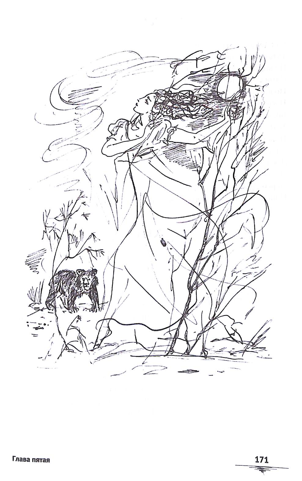 Вполне может Граблевская работать в жанре хоррора... Но не хочет — снижает пафос. Внизу справа — тот самый медведь, но с балалайкой. Недовольный читатель восклицает: "Только водки не хватает!" А водка-то есть: белочка Татьяне стакан протягивает (у Пушкина нету среди кошмаров белочки, это персонаж советского белогорячечного бреда). С этой особенностью Граблевской приходится считаться — постмодернизм на дворе.