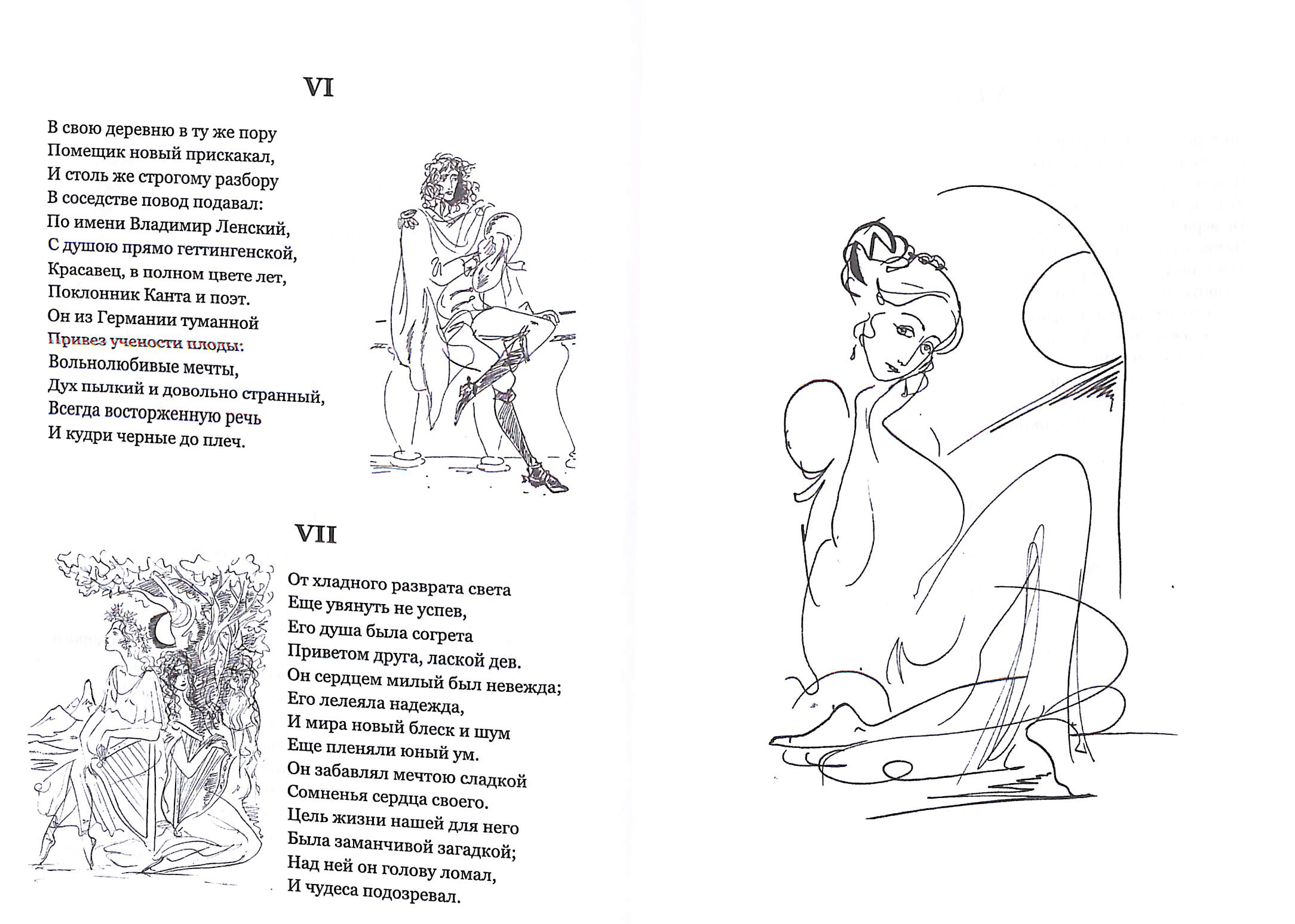 Никаких лирических отступлений Пушкина художник не иллюстрирует. Портрет Онегина и Пушкина не в счёт — их рисовали и самые правоверные реалисты.