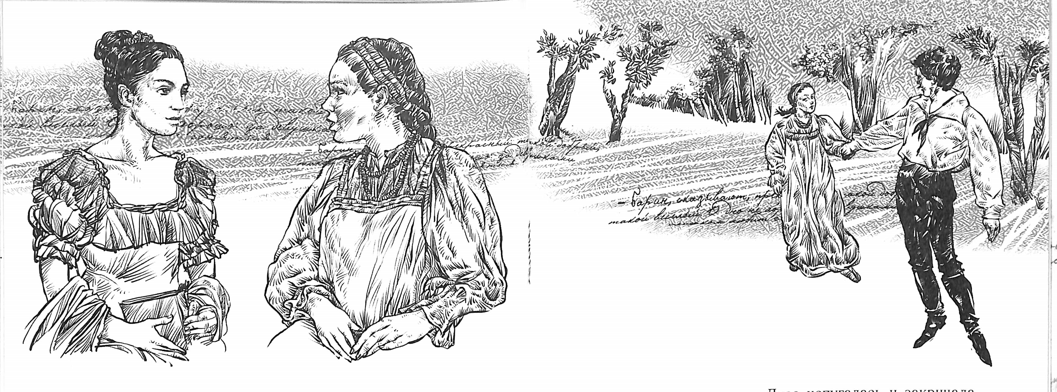 Иллюстрации в этой книге очень похожи на халтуру. Это перерисованные кадры из экранизаций к "Повестям Белкина". Сомнений почти не осталось, когда я разбирал картинки к "Метели" (см.).
