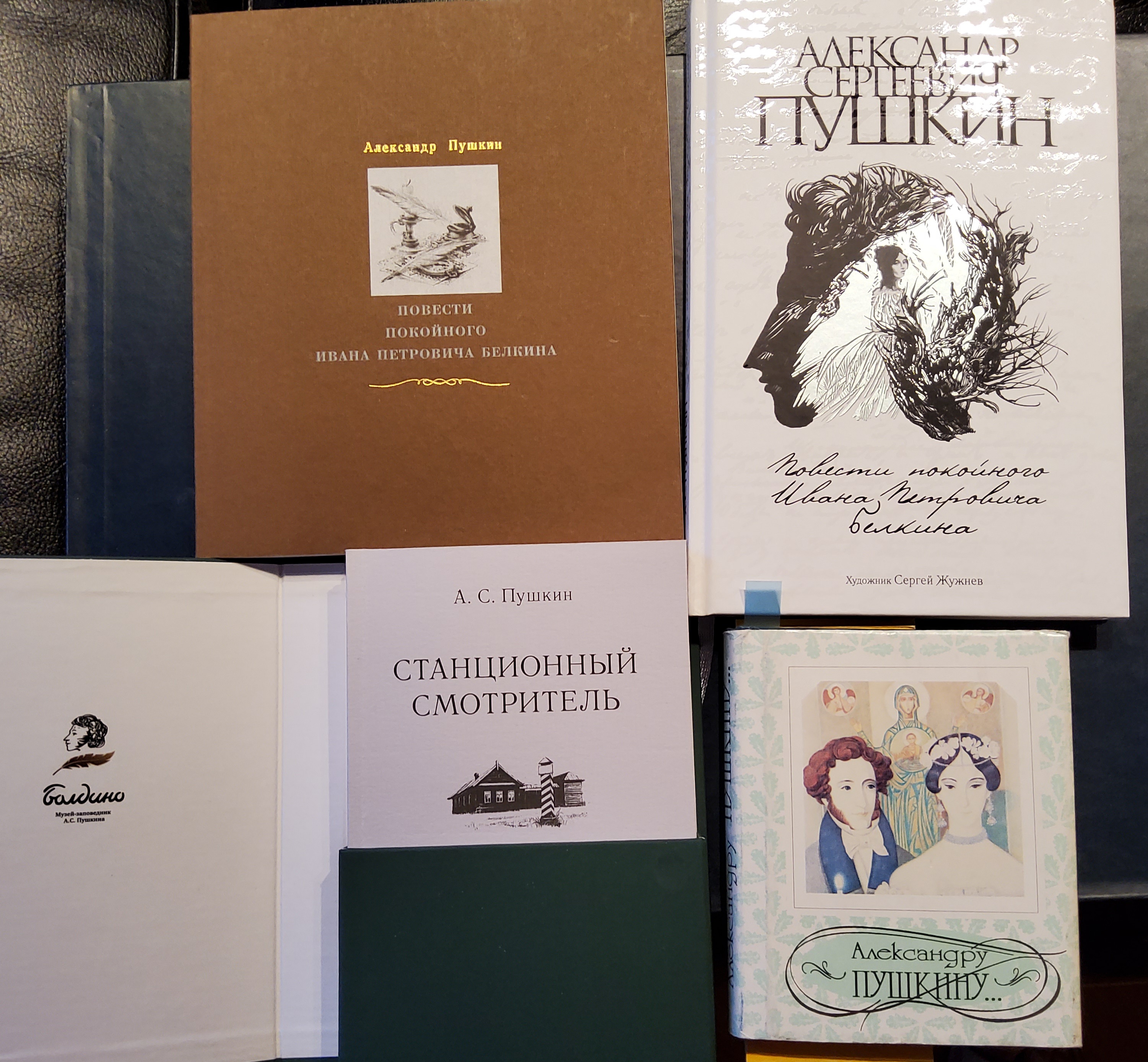 Внизу (слева направо): 3) "Станционный смотритель" (худ. А.Ростова). — М.: Проспект, 2019 (в боксе со всеми книжками "Повестей Белкина") 4) "Александру Пушкину..." Пушкиниана Дмитрия Арсенина (худ. Д.Арсенин). — Н.Новгород: Нижегородская ярмарка, 1994.