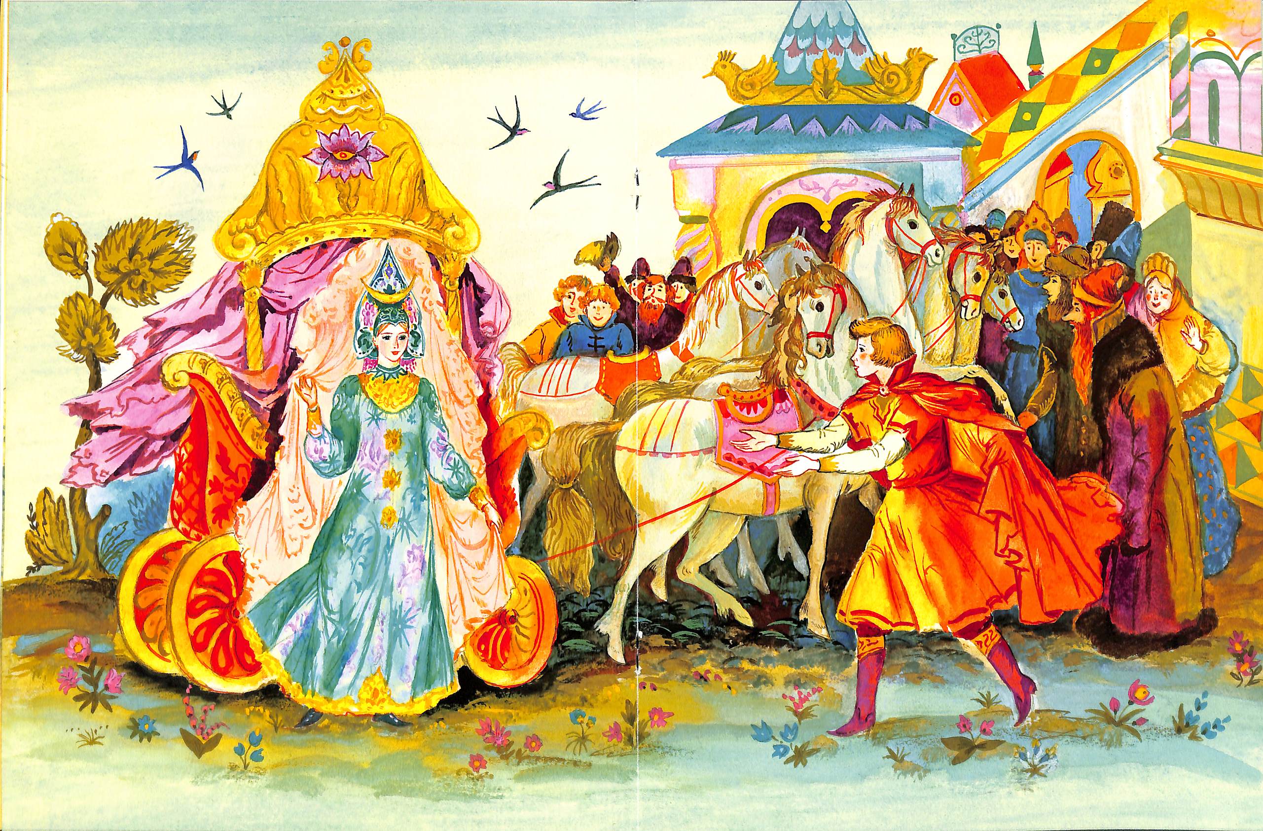4) Разворот, где присутствуют элементы стилизации под древнерусскую миниатюру: условное дерево на заднем плане, складки плаща Ивана-царевича, пряничный терем... Плюс яркие чистые цвета. Этого хватает для оригинальной атмосферы Палеха без того, чтобы выписывать в палехской манере все мельчайшие детали.