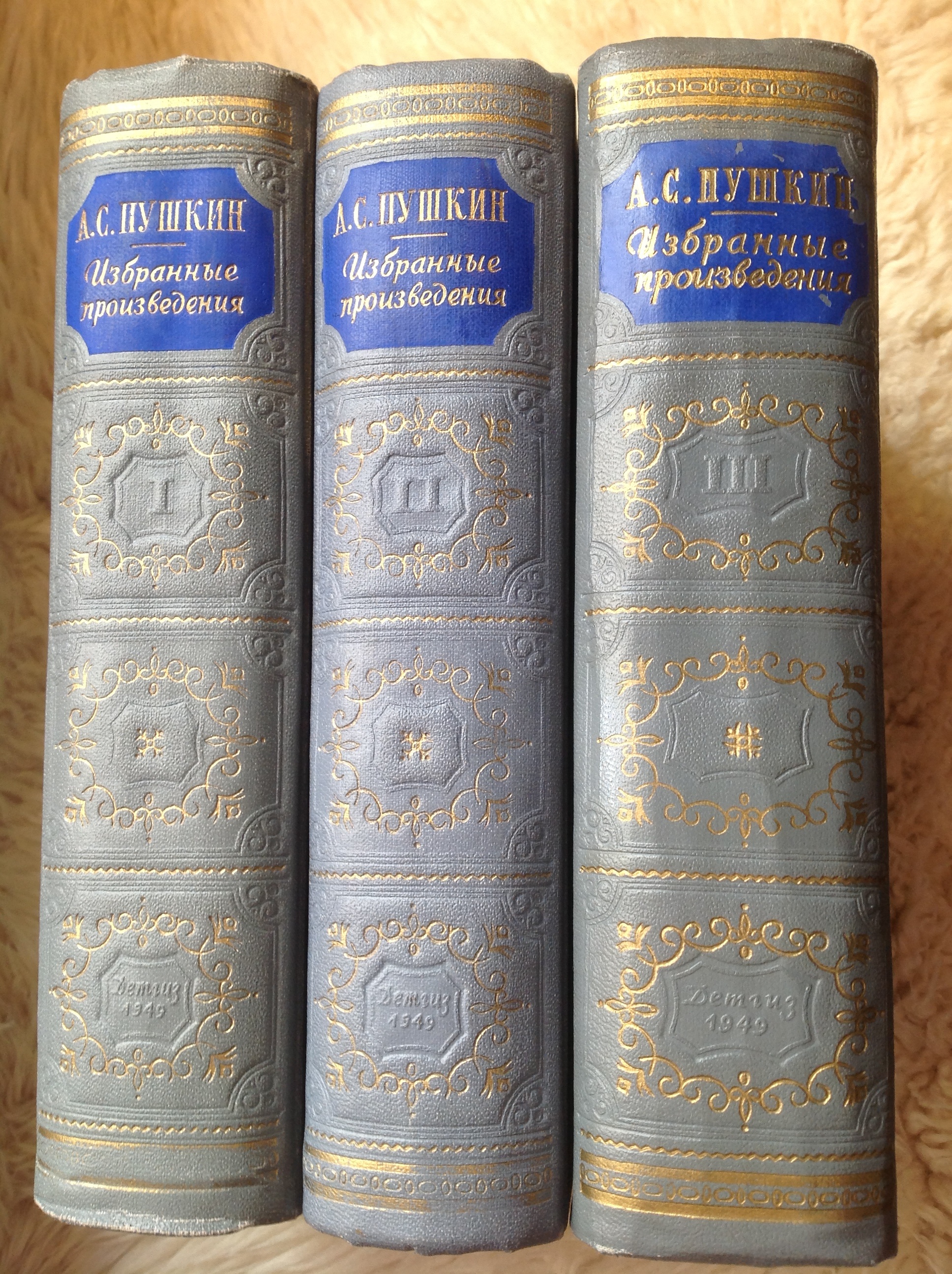 Сборник большого формата — "Лирика" (М.: ГИХЛ, 1949). На нём лежит сборник "Стихотворения" уменьшенного формата (М.: Художественная литература", 1974), а на нём — миниатюрная книжка "Стихотворения" (М.: Художественная литература", 1993).
