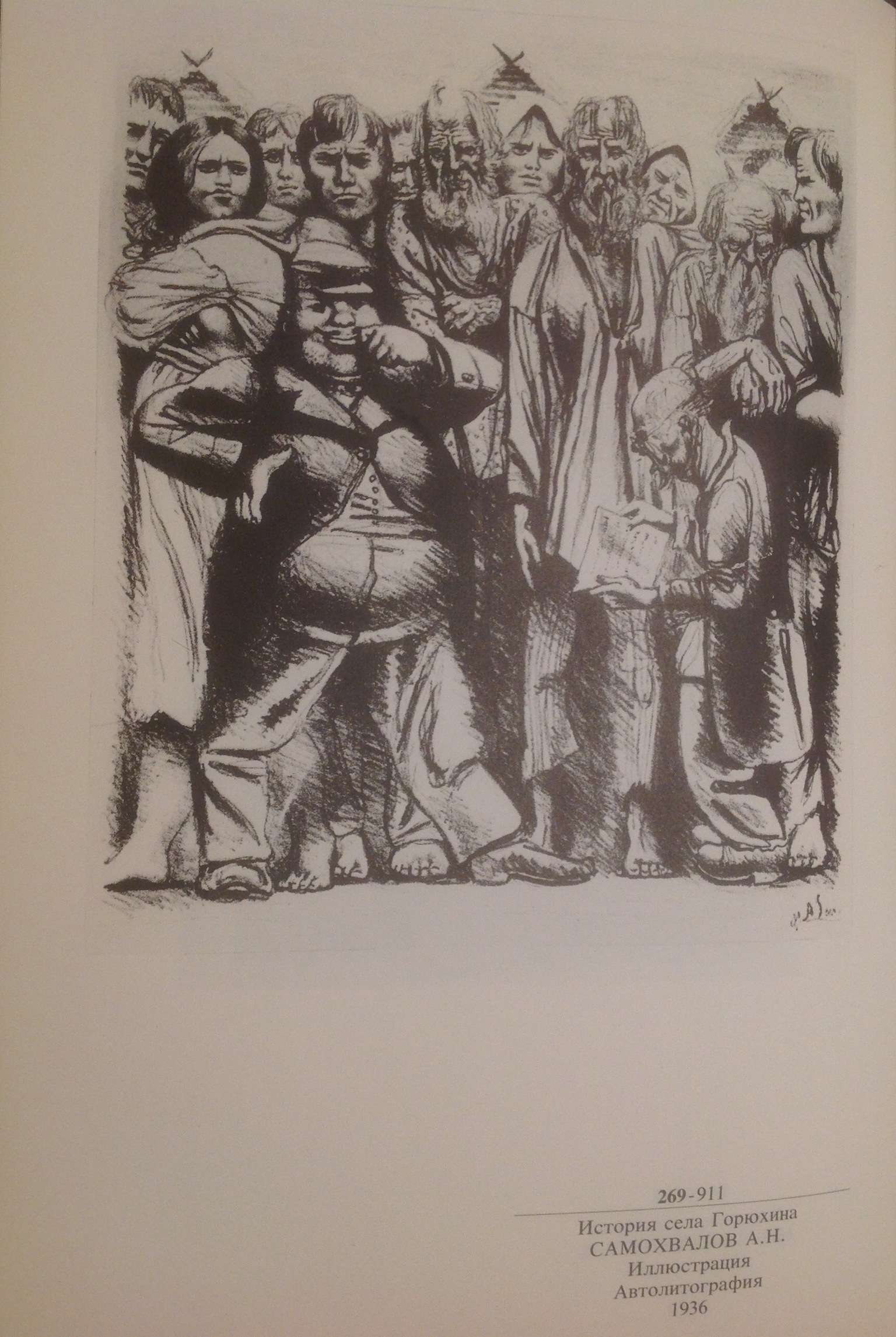 Советские иллюстраторы сталинского периода начали с отражения народной/крестьянской темы в "Истории села Горюхина" в соответствии с классовым истолкованием. Знаменитый художник А.Самохвалов дал групповой крестьянский портрет — у деревенской бедноты лица чересчур серьёзные, они уже верные союзники пролетариата. Но всё-таки у Самохвалова (отличного художника) все персонажи с характером, а которые крестьяне не пролетарии, так те с юмором нарисованы.