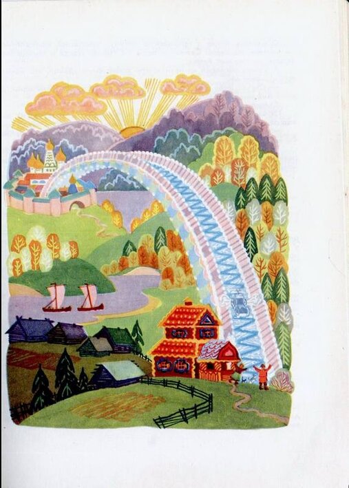 Художник К.Овчинников славен ажурностью своих условных пейзажей и сочетанием розового с голубым. К этой сказке у художника была только одна иллюстрация. И вот результат: выдающихся художественных качеств кружевной мост Овчинникова.