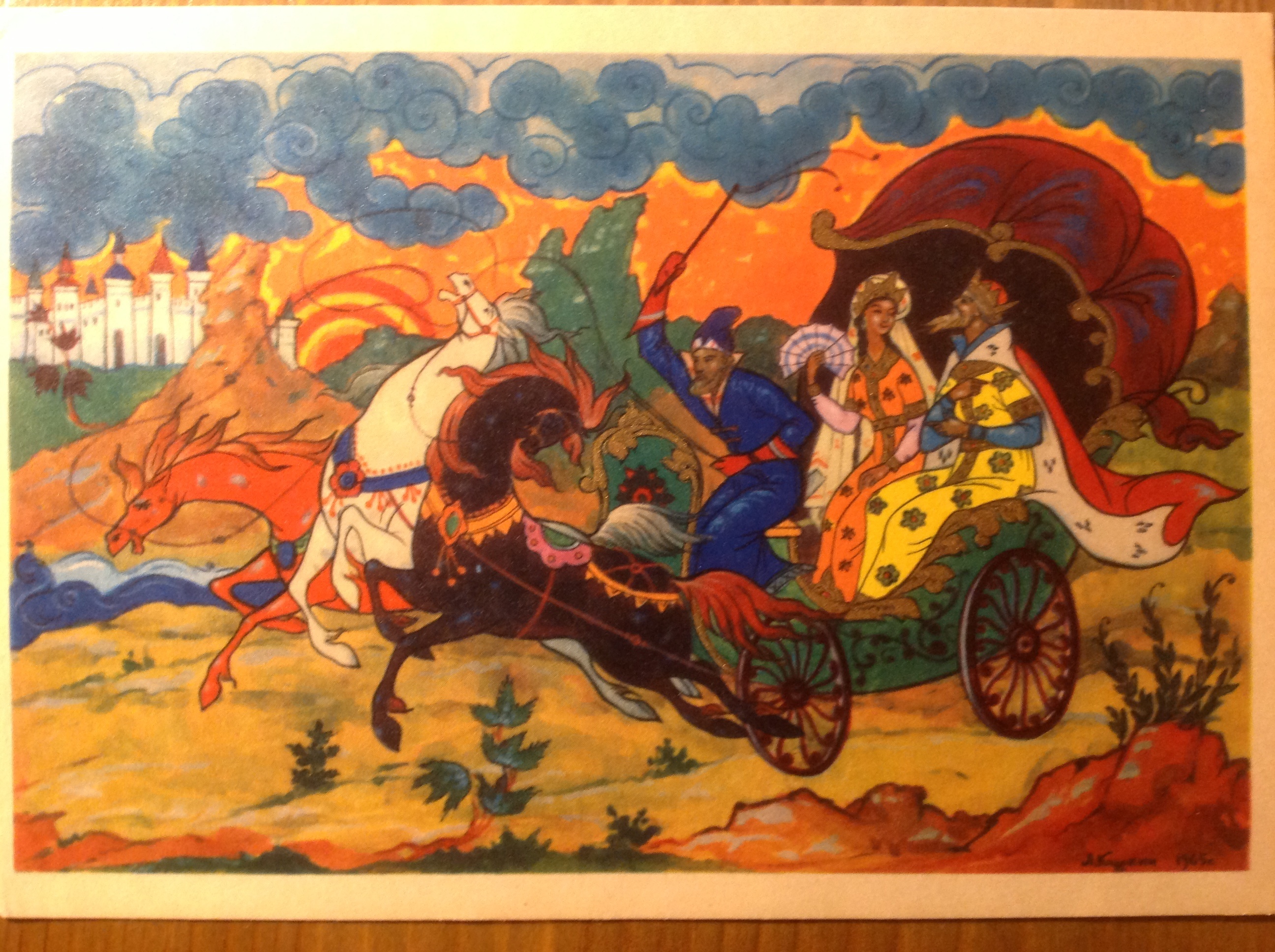 Комплект из 16 открыток отображает сюжет сказки о-о-очень подробно. Темп теряется. Пару открыток выпущу (сканы полного комплекта можно посмотреть, например, здесь).