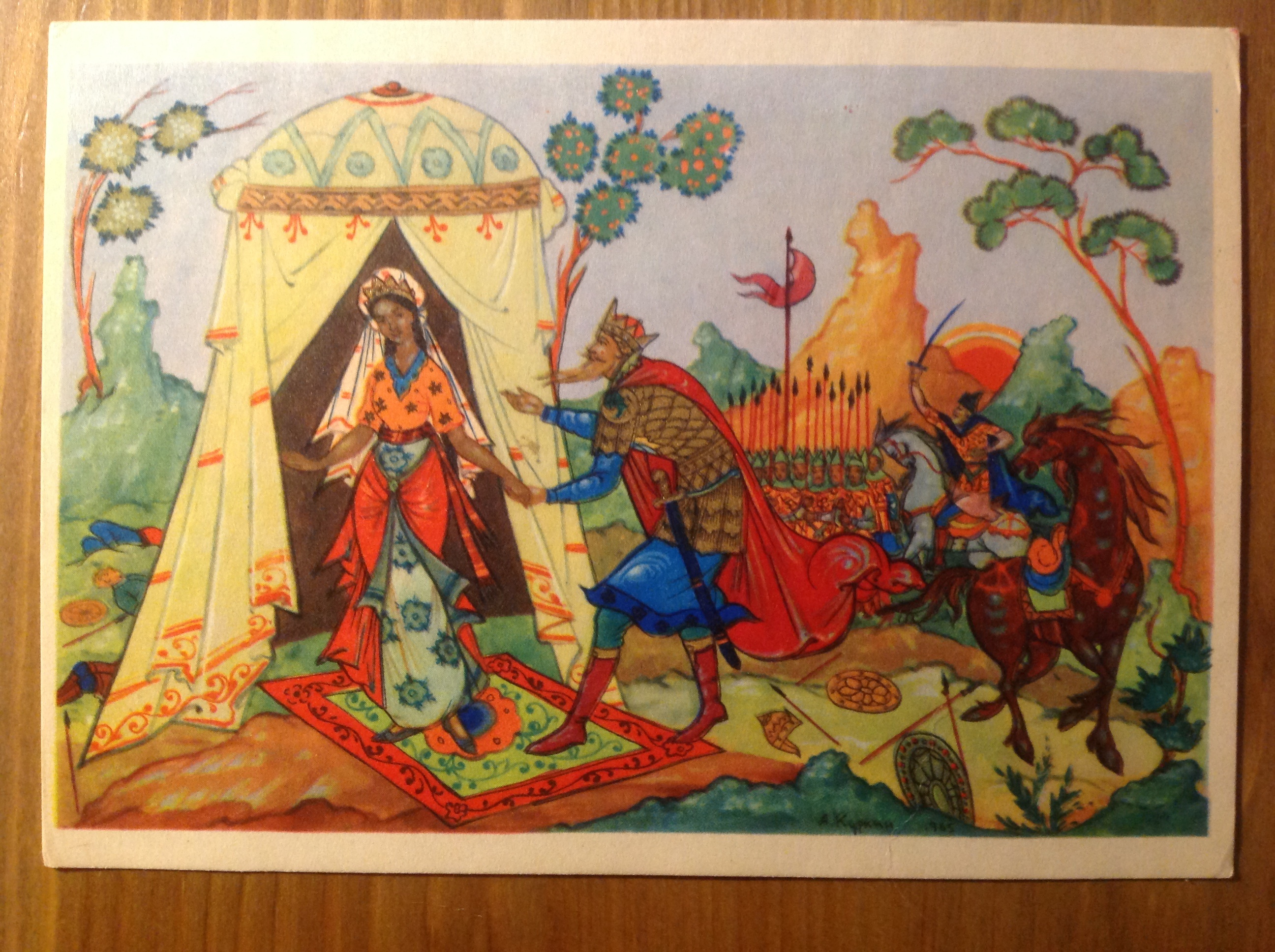 Вверху слева: "Сказка о золотом петушке" — набор открыток (12 шт.). Худ. А.Куркин (Палех). — М.: Советский художник, 1968. Тираж — 1.500.000 экз. Цена — 54 коп.