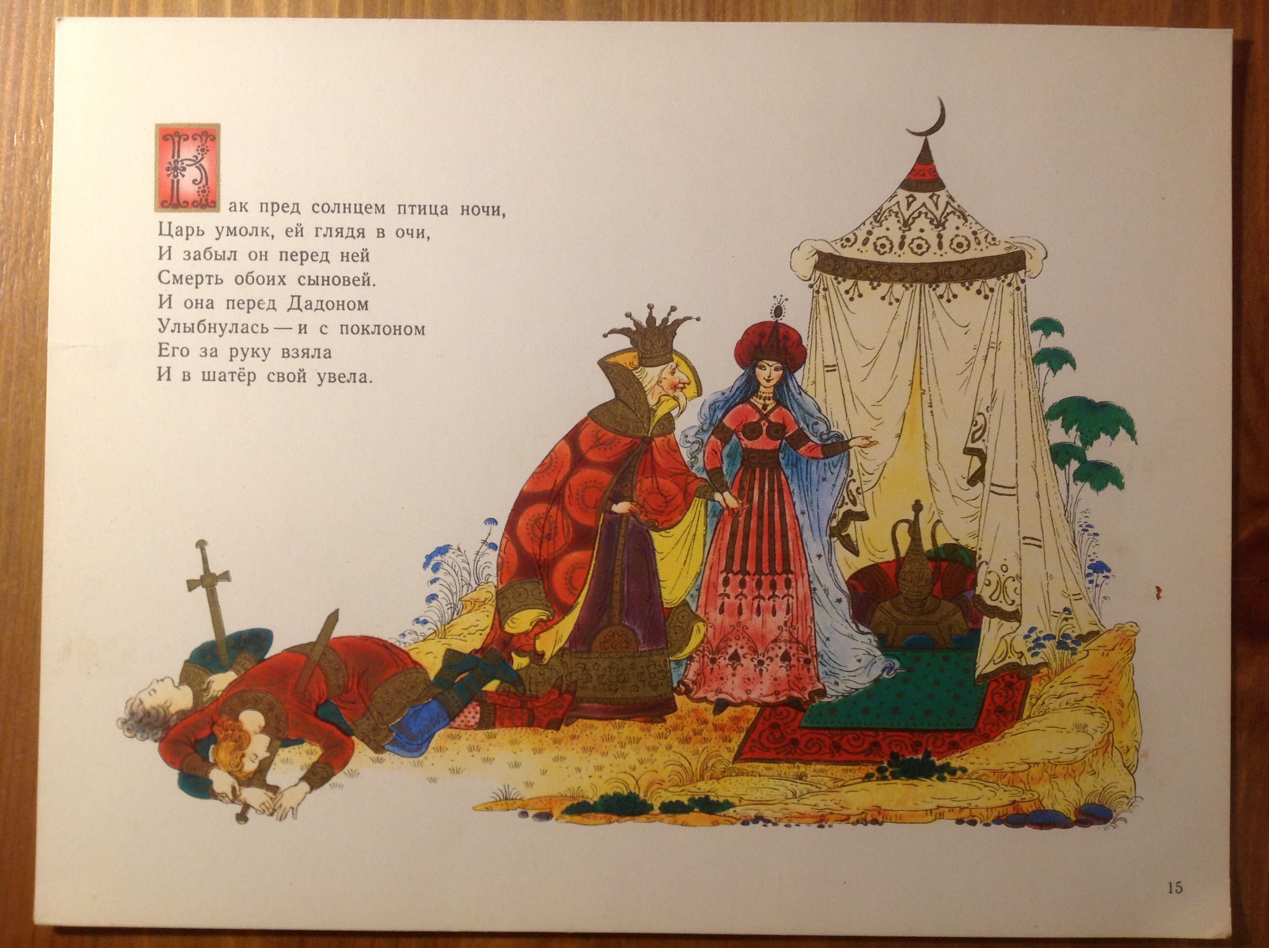 Для любознательных: вот как выглядит нераскрашеная последняя иллюстрация Пашкова (только золото нанесено) из фондов музея (альбом "Мир сказок Пушкина").