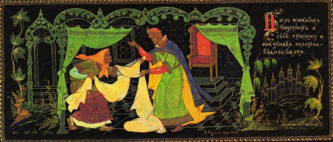 А про старушку в концовке просто не было повода рассказать: она в первый раз в иллюстрациях встречается. В варианте Афанасьева после смерти мачехи и сводных сестёр Василиса ушла из дома, поселилась у какой-то безымянной старушки. Старушка и стала посредницей в сношениях между Василисой и царём. После свадьбы Василиса старушку к себе взяла. Отца, кстати, не взяла — видимо, не просто так из родительского дома ушла в этом пересказе.