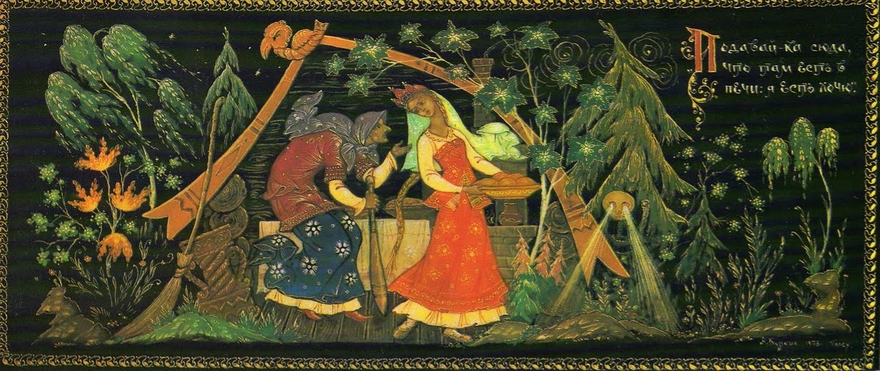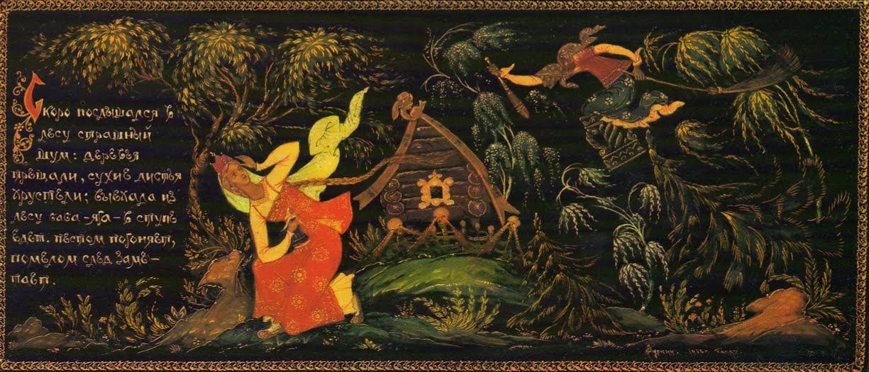 Баба-Яга очеловечена: старая женщина с тёмным лицом. Это соответствует имеющейся у Афанасьева трактовке: его Баба-Яга не выступает абсолютным злом.
