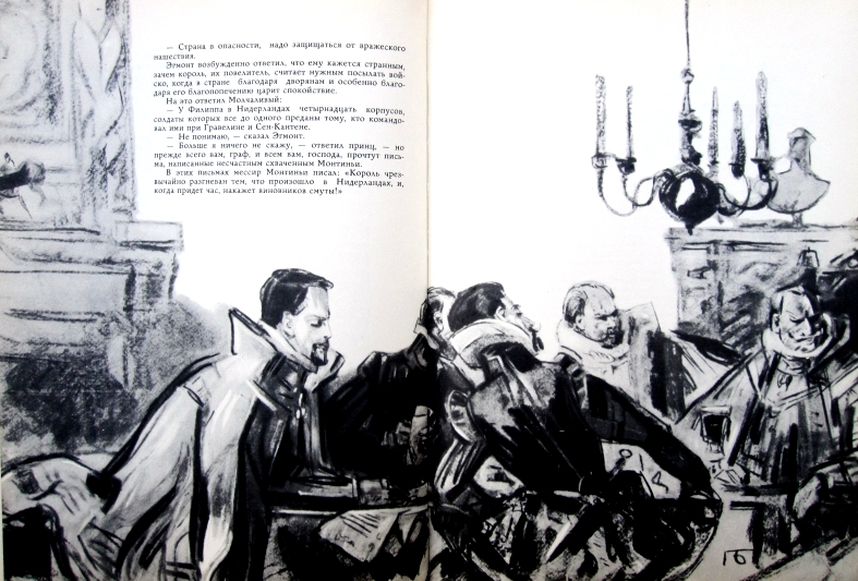 На фронтисписах задаётся тон всей сюиты. У Кибрика — это противостояние Тиля и Филиппа II Кровавого.