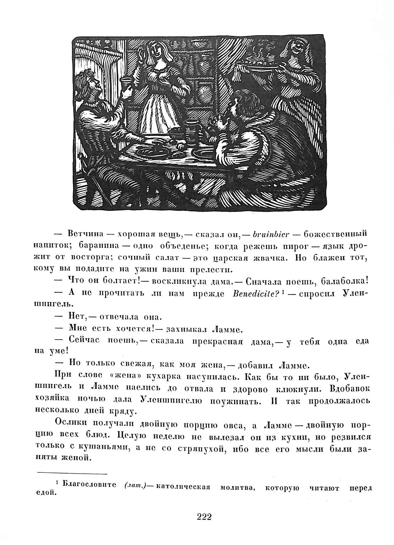 Замечательный ксилограф Ф.Константинов "Легенду об Уленшпигеле" проиллюстрировал вяло. Может быть, вообще, гравюр по дереву не должно быть в книге много: всё-таки это эстампы, которые воспринимаются как самодостаточные произведения. Не барское это дело: проходные сцены вырезать по дереву. В общем, на заставке Константинов поместил кормление монаха в клетке.