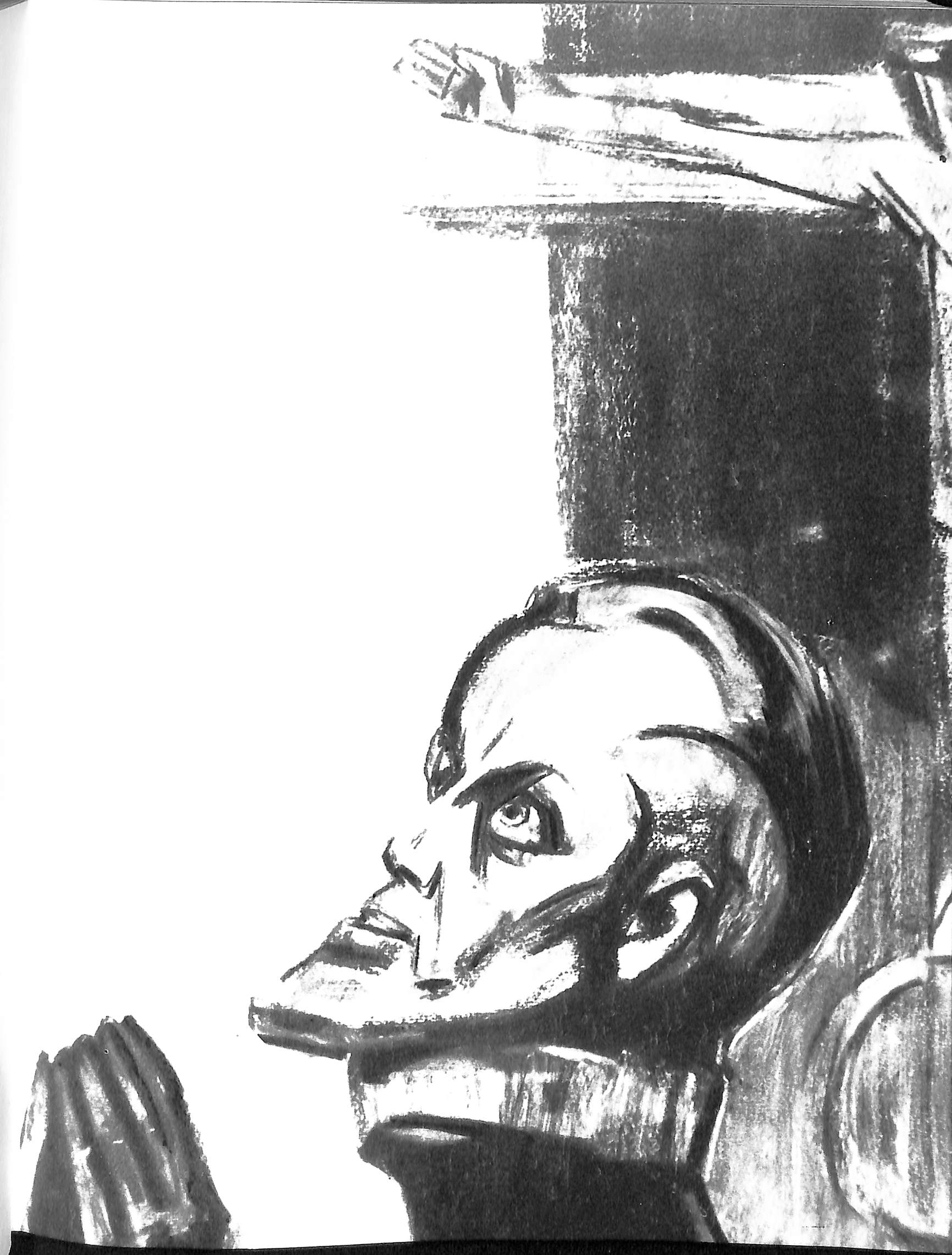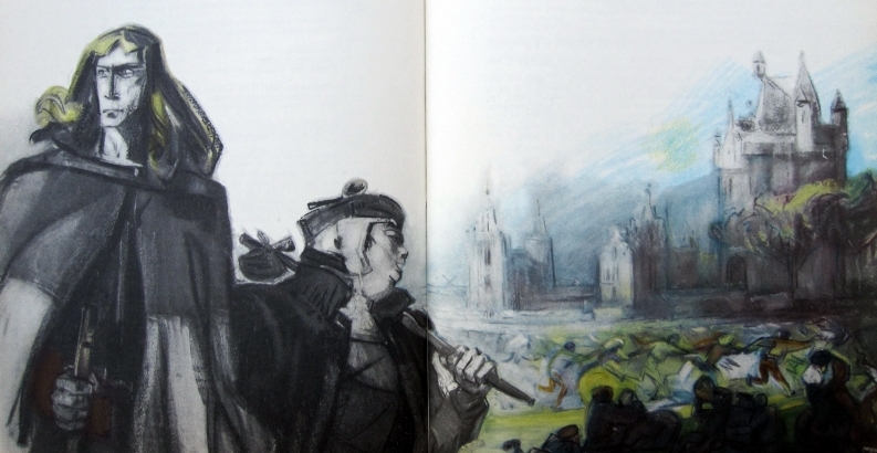 Третья книга "Легенды об Уленшпигеле" — объёмная. Де Костер пытается войти повторно в воду Первой книги. Тут и беззаботность проделок Тиля, и появление призраков прошлого — Рыбника, донос которого перевернул жизнь Уленшпигеля, и напоминание о Каталине, у которой огонь рвётся из головы. Как выразить в одной иллюстрации квинтэссенцию Третьей книги? Такая задача стояла перед Кравченко и Бисти. Оба они выбрали военную тему. Бисти — отвлечённо, дал Уленшпигелю мушкет (или аркебузу). А Кравченко — роскошно вырезал сцену дуэли Уленшпигеля с немецким наёмником.