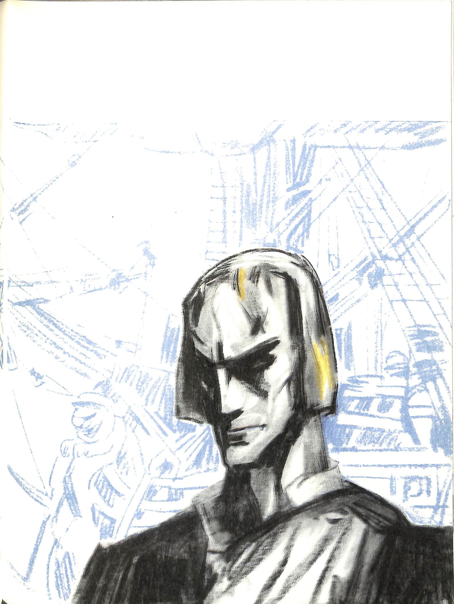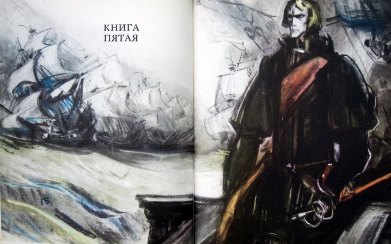 Очень сочетается романтизм художника с романтизмом романа. Вот вводная заставка. Она простенькая, но тема моря (занимающая не главное место в сюжете) привлекает внимание наших иллюстраторов: так они воспринимают дух великой морской державы — Нидерландов/Голландии (хотя во время описываемой революции корабли не бороздили океан, а сновали вдоль берегов).