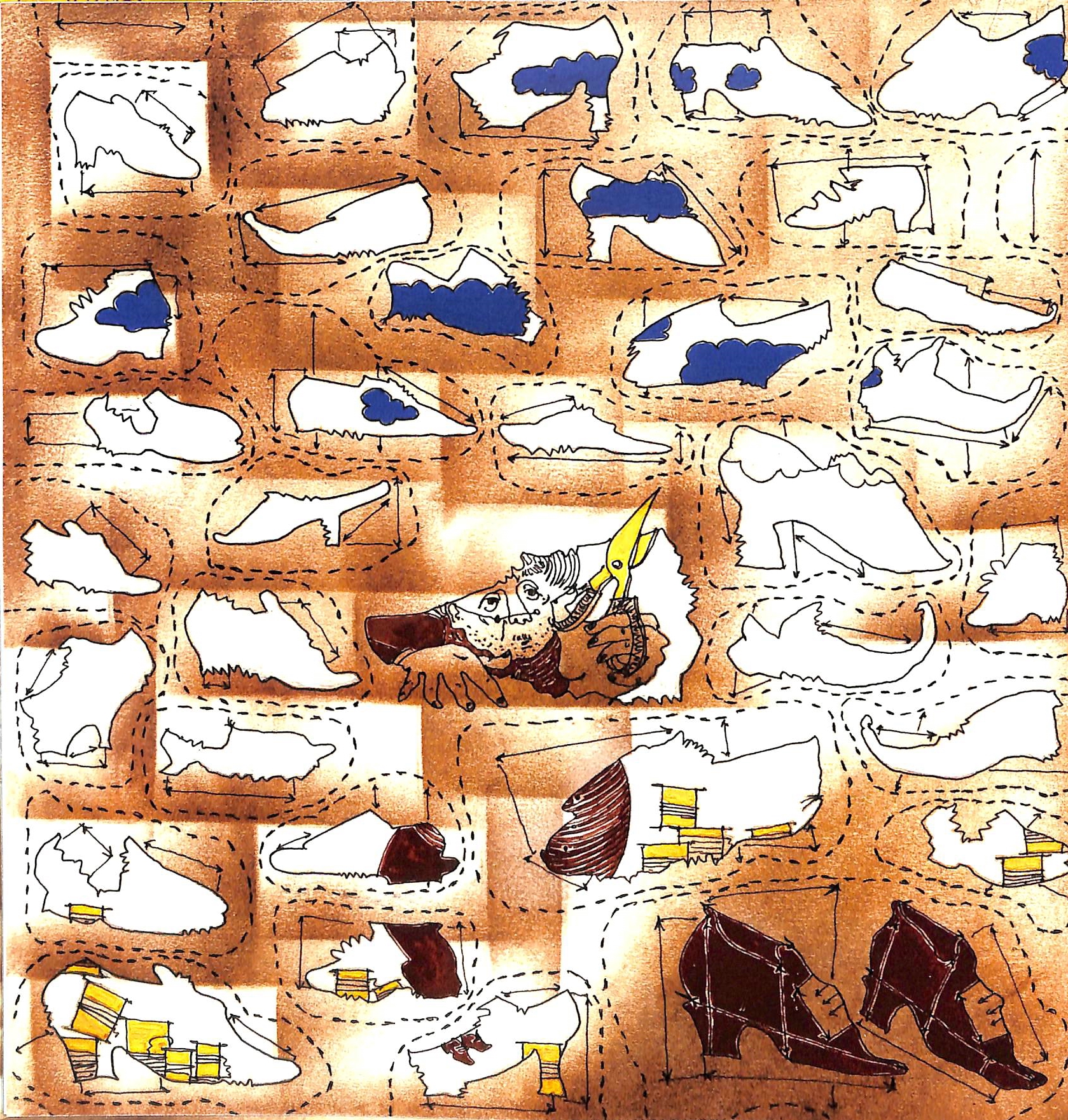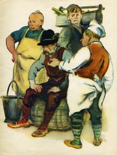 У Ломаева в иллюстрированных им сказках, по-моему, одна концепция: уличное театральное представление. Танцуют все. Жизнерадостность начинает утомлять. Вот ломаевские сапожник с женой.