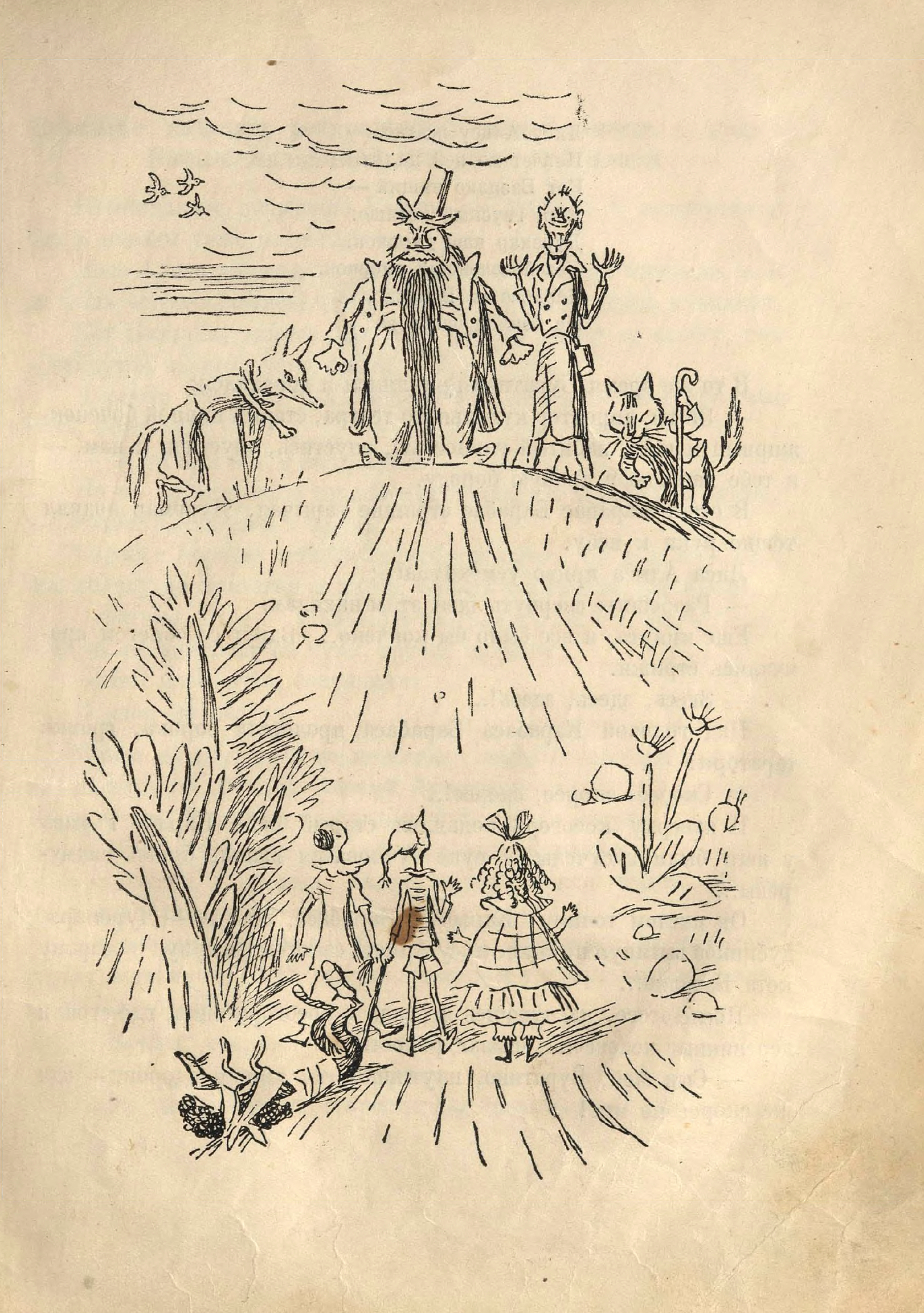 На фронтисписе эпизод с бегством Мальвины и компании под водительством Буратино. Единственный рисунок, который слегка тонирован. Внутри книги все рисунки чёрно-белые.