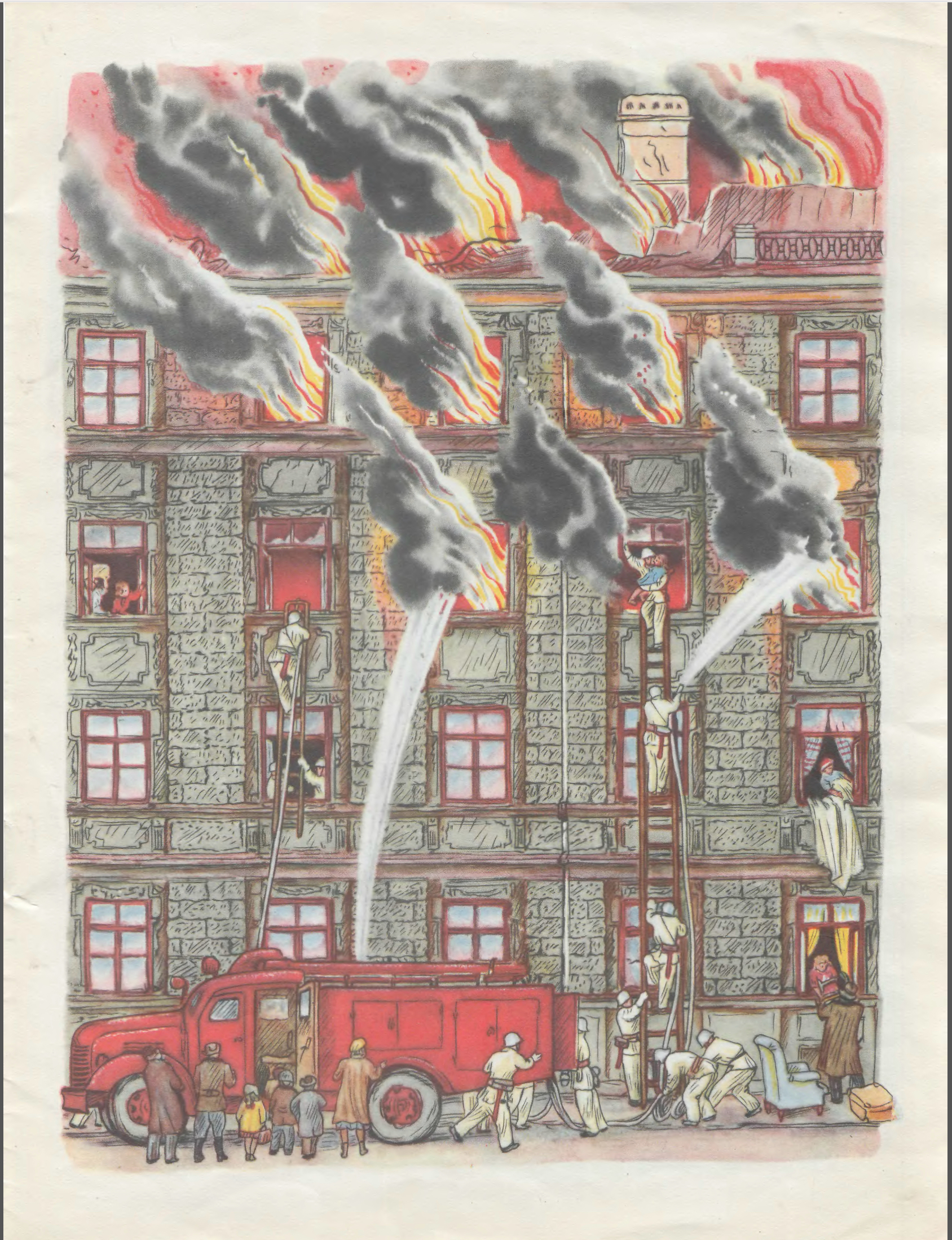 Книжка про трагедию, но в Двадцатые бурные годы и Маршаку, и Конашевичу битва с огнём представлялась в романтических красках. Молодость, революция... Но зато в варианте иллюстраций 1923 года это настоящая битва с огнём, захватывающая и увлекающая. Настоящая живопись. Настоящие жертвы — вон с какой высоты двое пожарных падают ("злой огонь ревёт и пышет, двух пожарных сбросил с крыши").