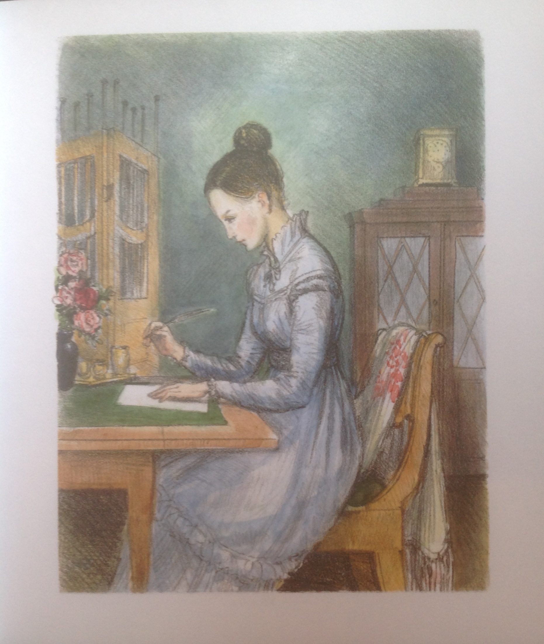 Но в этой книге фигуры на иллюстрациях слишком статичные, а цвета сочные, но как будто потёртые — и получается что-то не совсем традиционное. Когда такие иллюстрации соотносятся с пушкинским временем, вдруг бросается в глаза сходство с нашим известным живописцем П.Федотовым ("Сватовство майора", "Завтрак аристократа" и проч.).