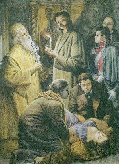 2) Вот жестокая шутка гусара Бурмина в церкви. Тесная композиция, свойственная станковой живописи (сцены церковных венчаний — русская тема).