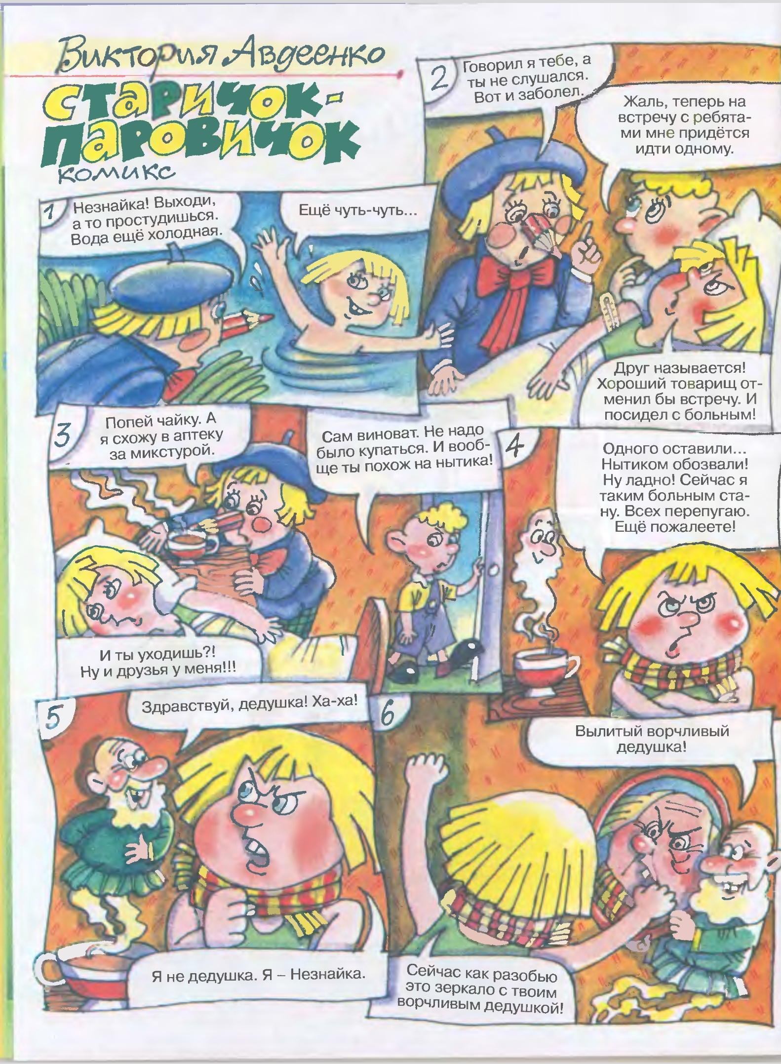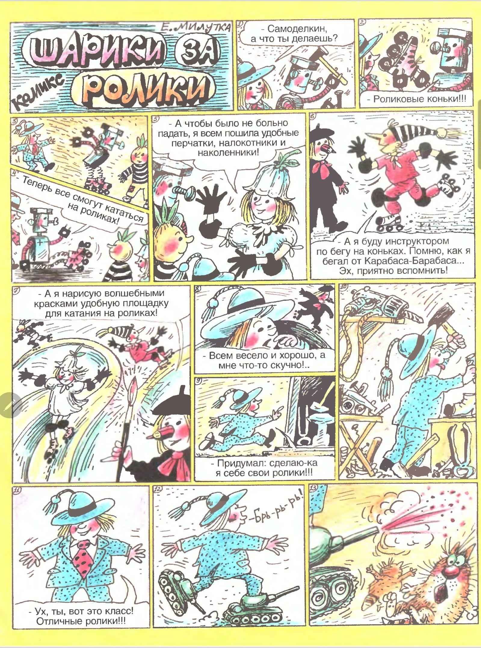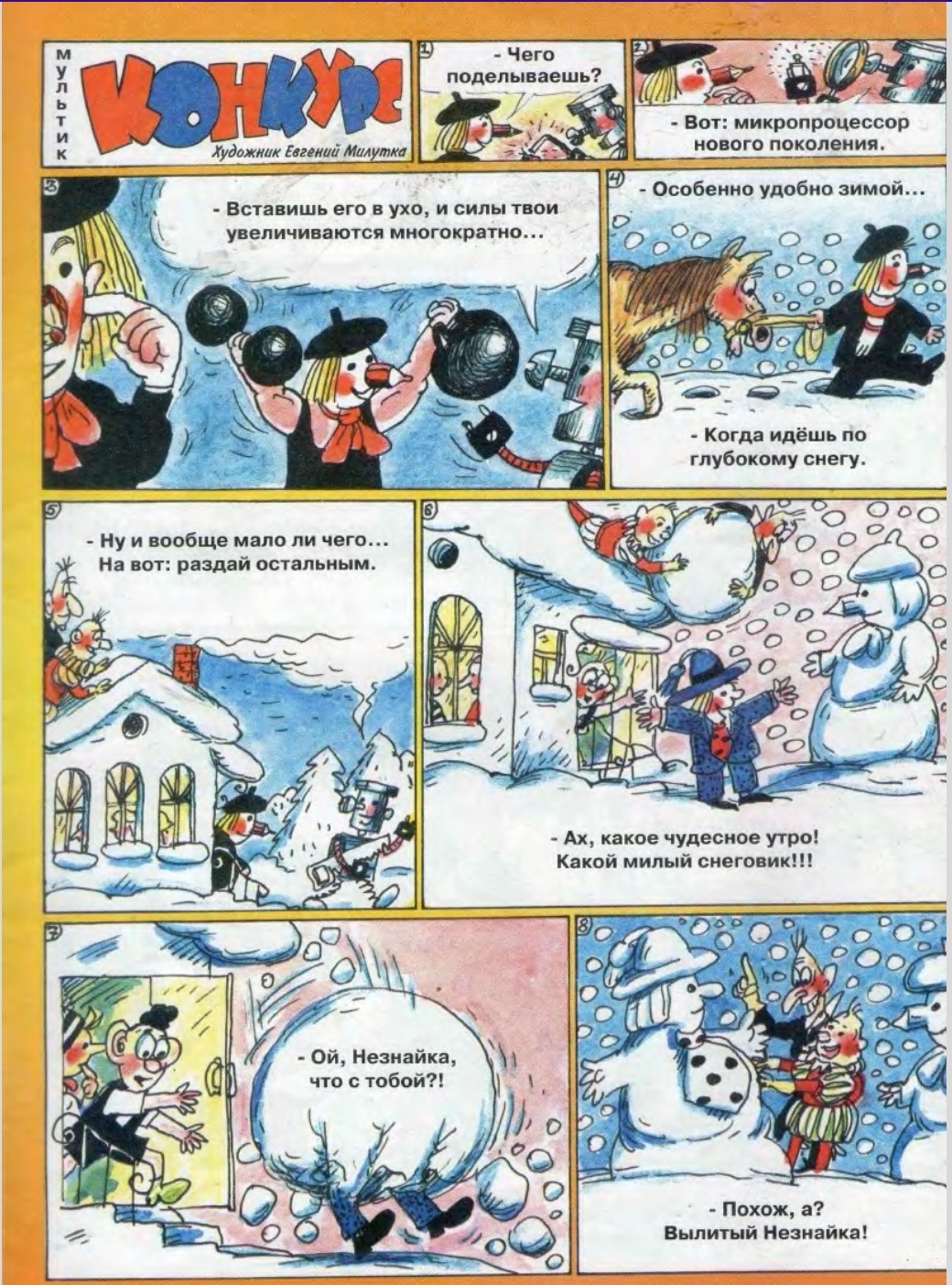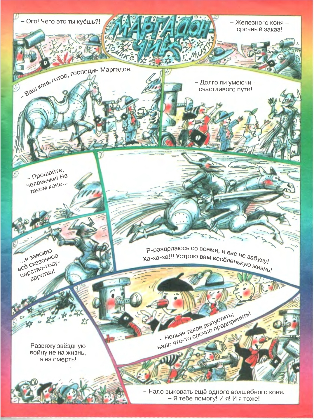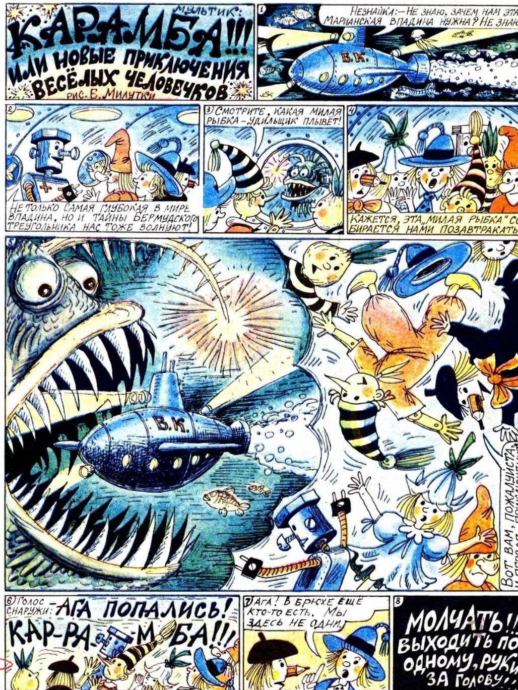 3) Комиксы. Это бенефис Милутки. Фантазия неисчерпаемая. Незнайка эпохи Девяностых — это Незнайка из комиксов Милутки. Милый, чуть туповатый персонаж.