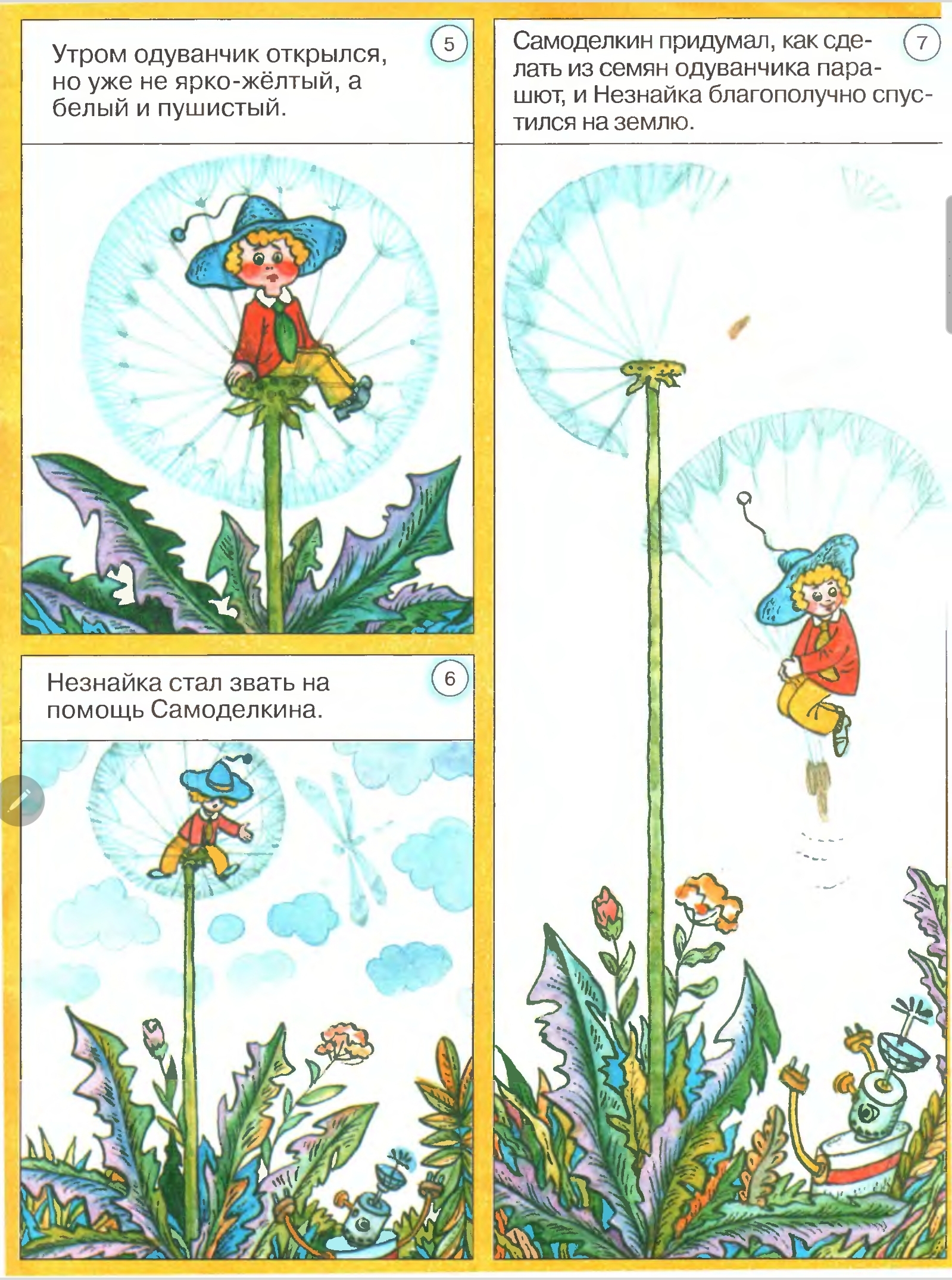 2) Современный полёт Незнайки на Луну. Пока он летает, другие человечки чуть не угорели (злодеи подстроили). Незнайка всех спас.
