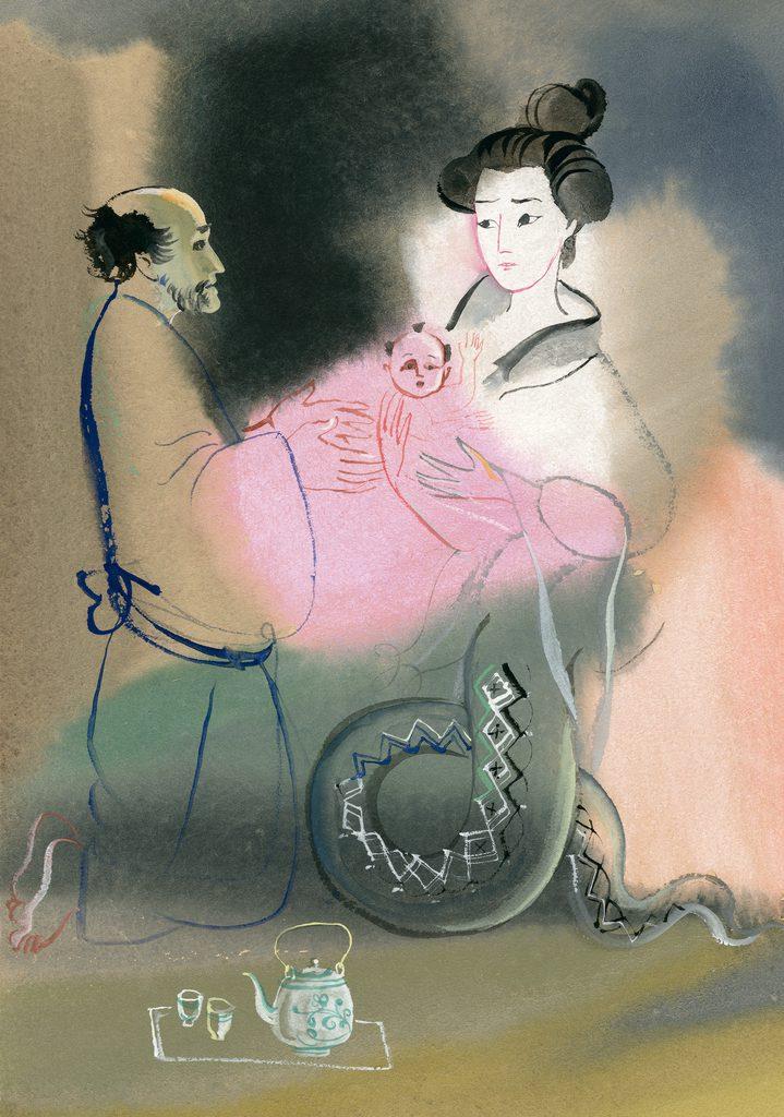 Картинку к японской сказке "Как черти старика вылечили" я уже показывал в ряду прочих (тут). А есть ещё картинки к китайской и вьетнамской сказкам. Посмотрим все три, но с точки зрения стилизации.