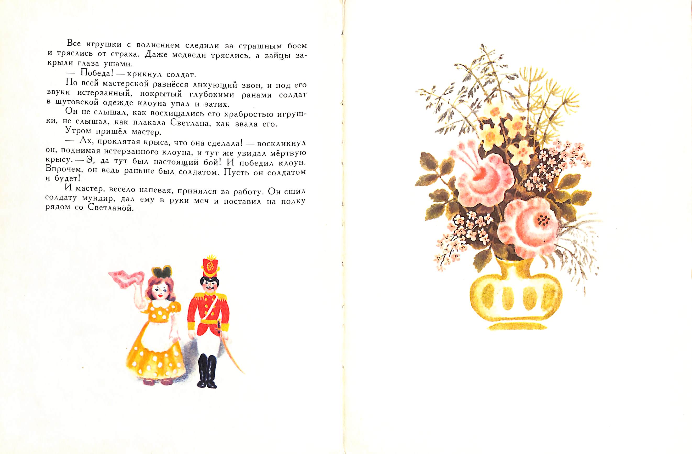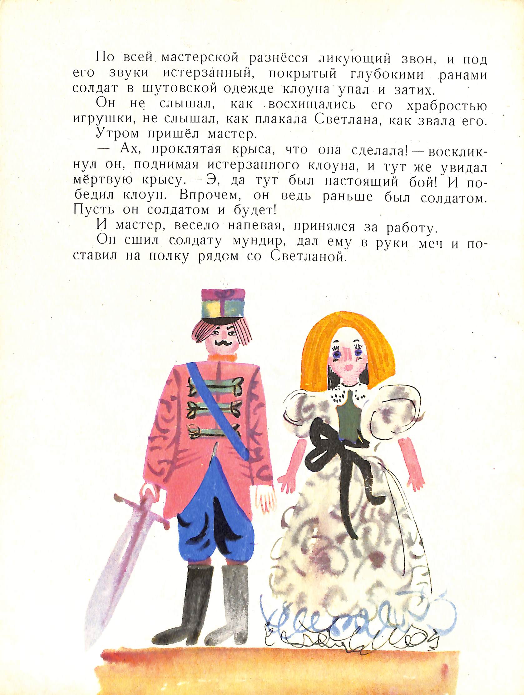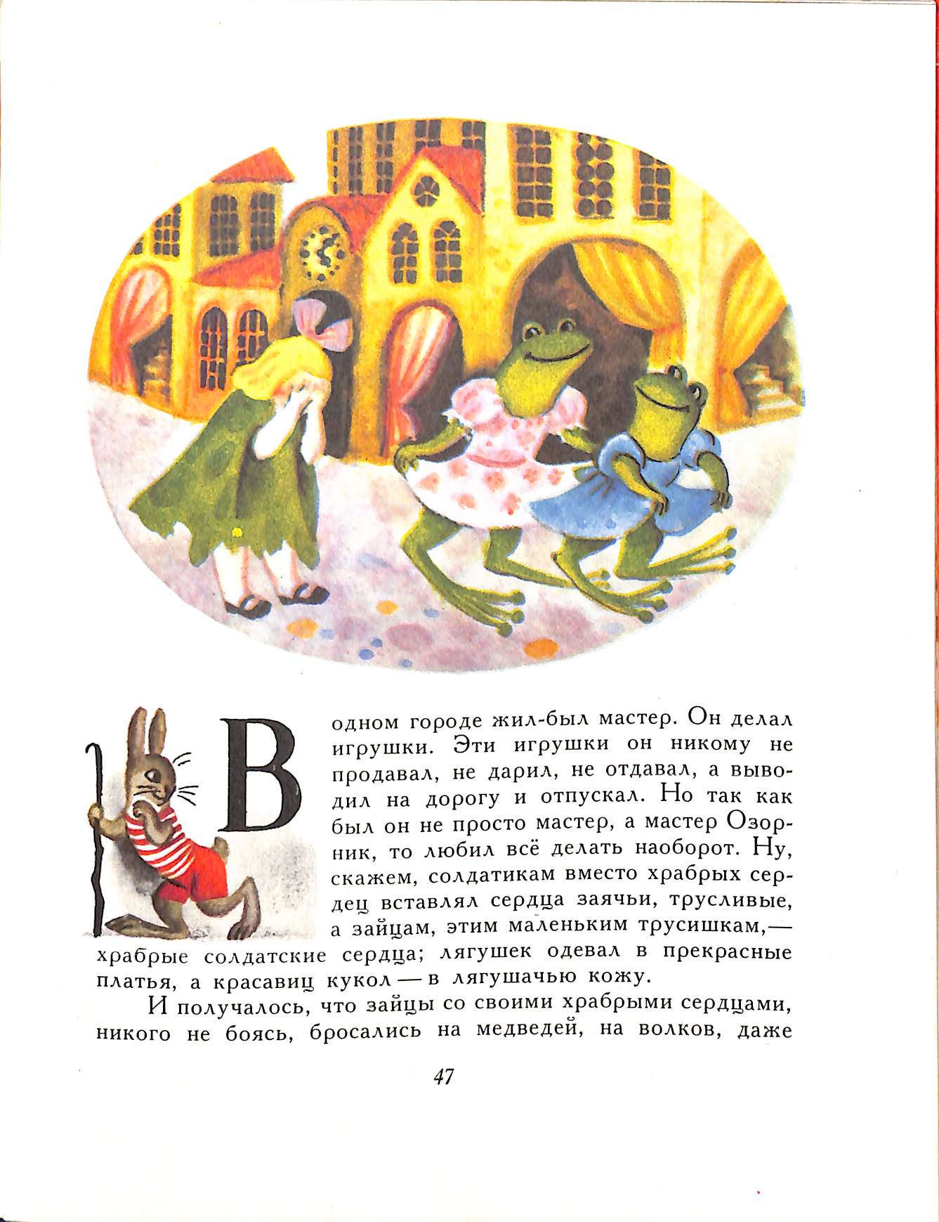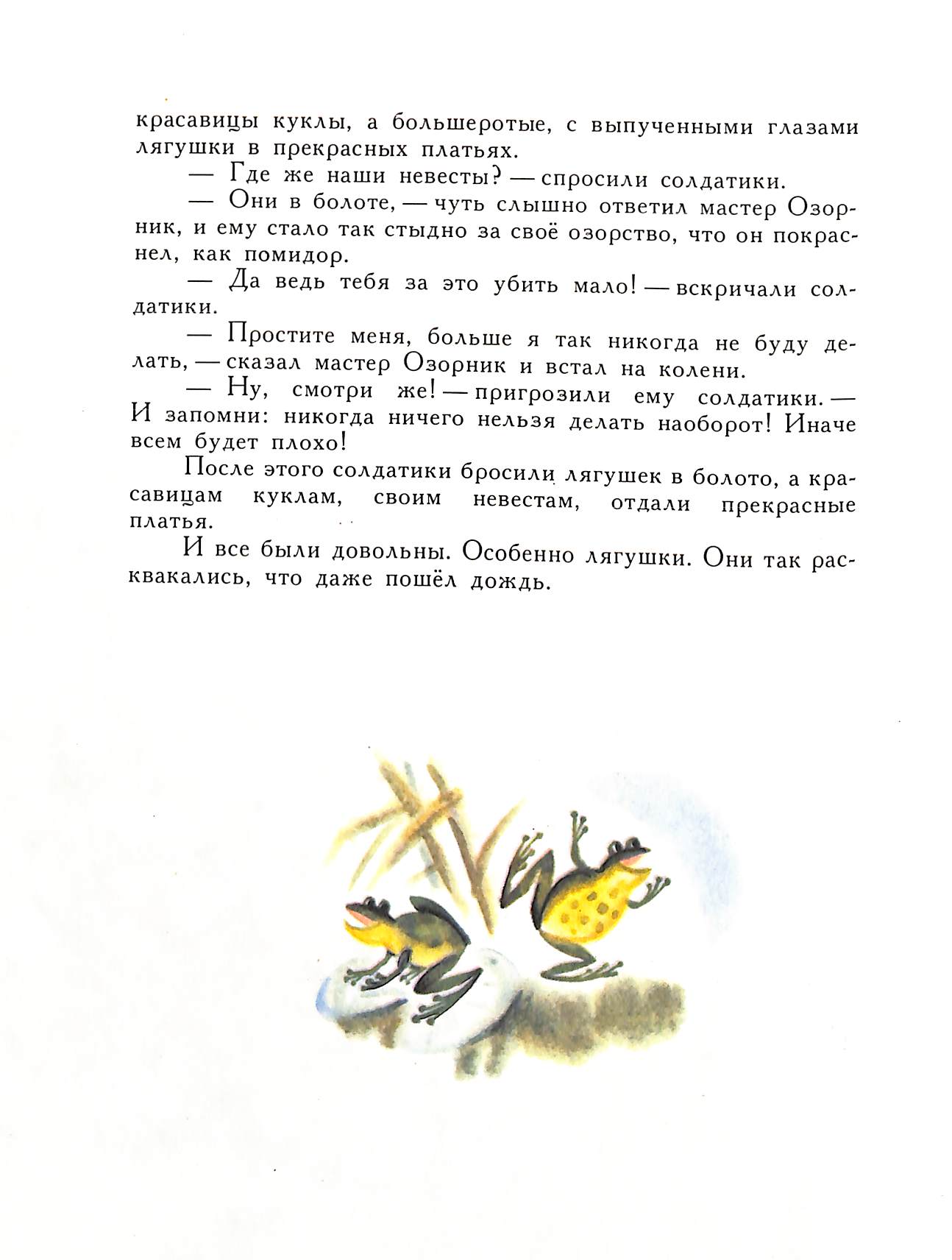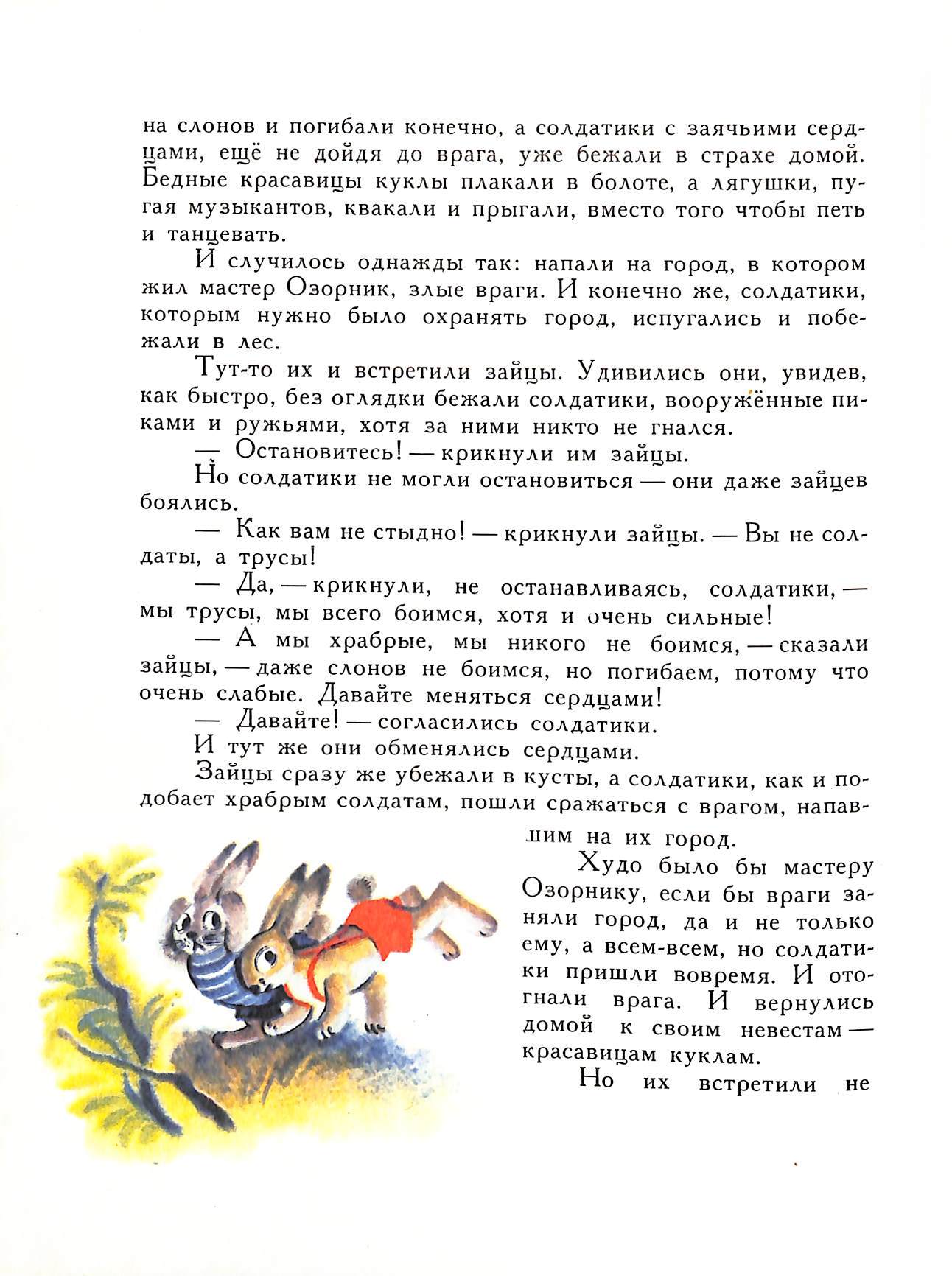 ...солдатикам вместо храбрых сердец вставлял сердца заячьи, трусливые, а зайцам, этим маленьким трусишкам, — храбрые солдатские сердца; лягушек одевал в прекрасные платья, а красавиц кукол в лягушечью кожу