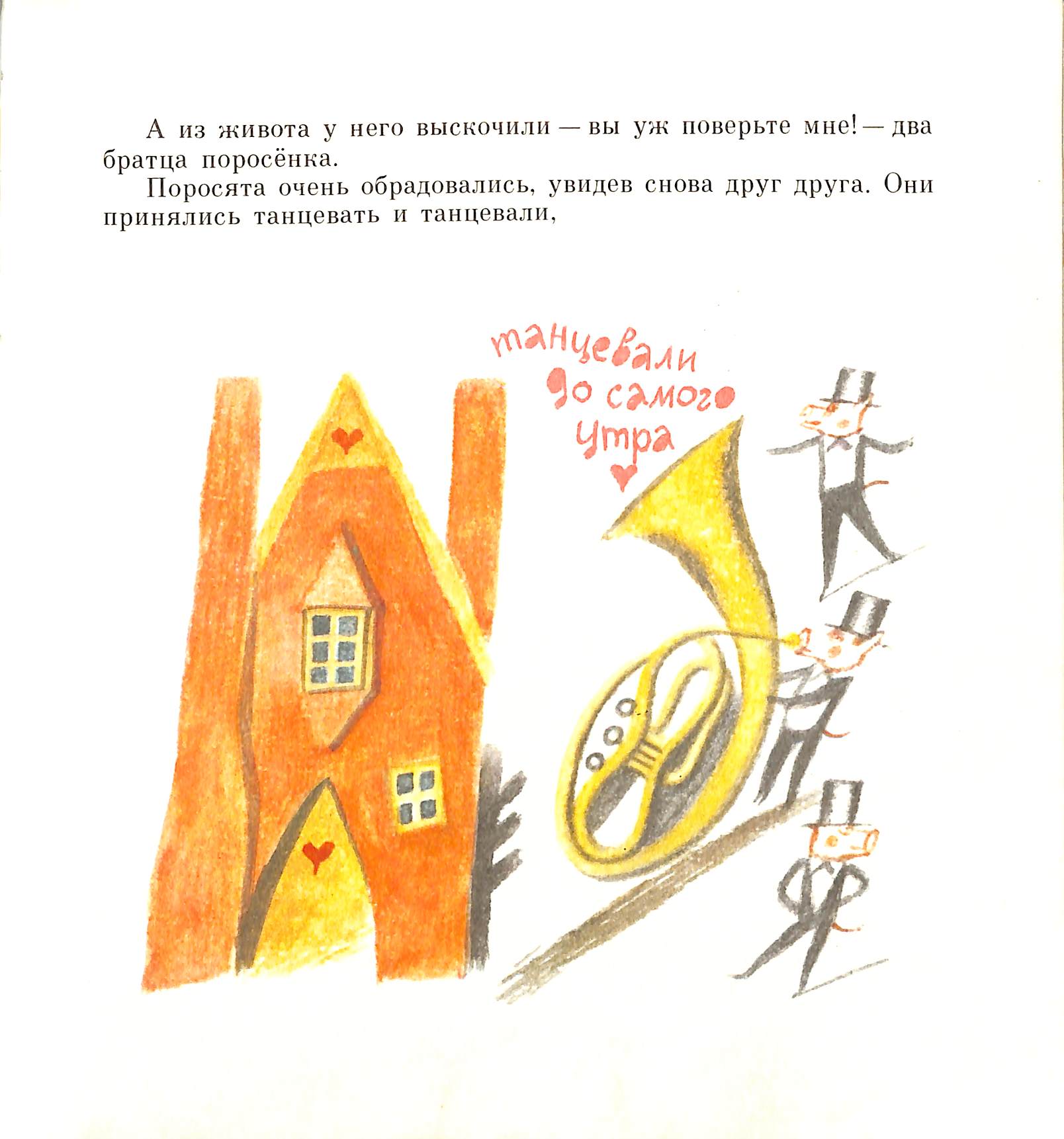 Пересказ Шерешевской в этой книжке совсем для маленьких детей, жестокий конец сказки (два первых братца с хилыми домишками погибли в пасти волка) переделан — съеденые поросята выскочили из живота ошпаренного волка. Но чувствуется в этом фальшь — как-то это не по-английски, не по-пуритански. Что, можно вот так на халяву построить замок из песка, и всё равно будешь победу праздновать наравне с крепким хозяйственником? Какая-то французская мелодрама про Красную шапочку получается.
