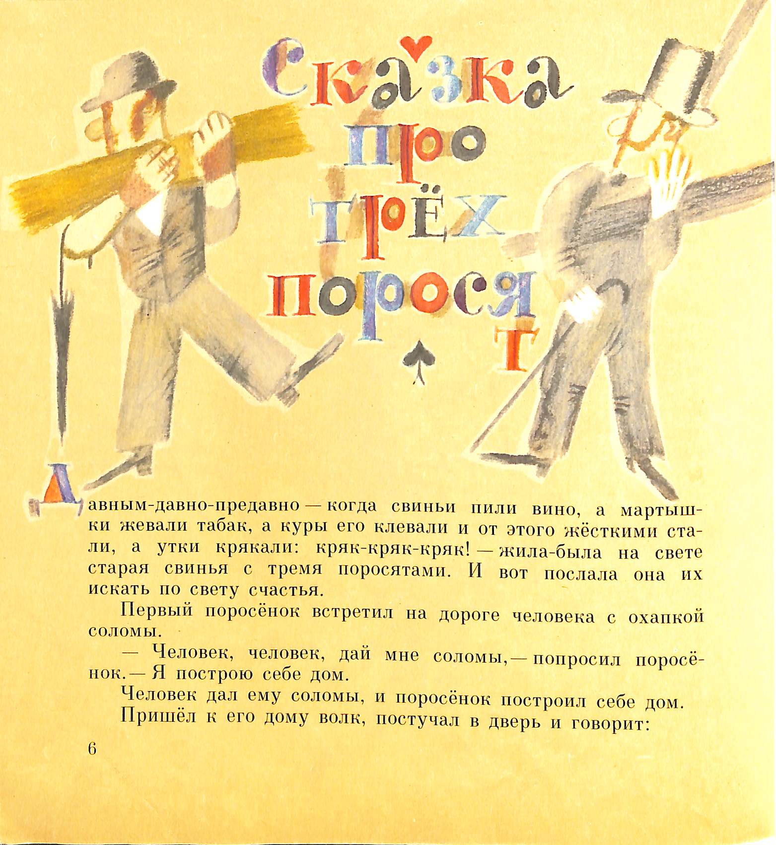 Непривычное начало: изображены люди со стройматериалами. А дело в том, что в английской сказке поросята лишены свободы выбора, они попрошайничают у людей — что им люди дадут, из того они дом и строят. Случай и предопределённость для английских поросят — воля имеется только у американских свиней (у советских тоже — благодаря Михалкову).