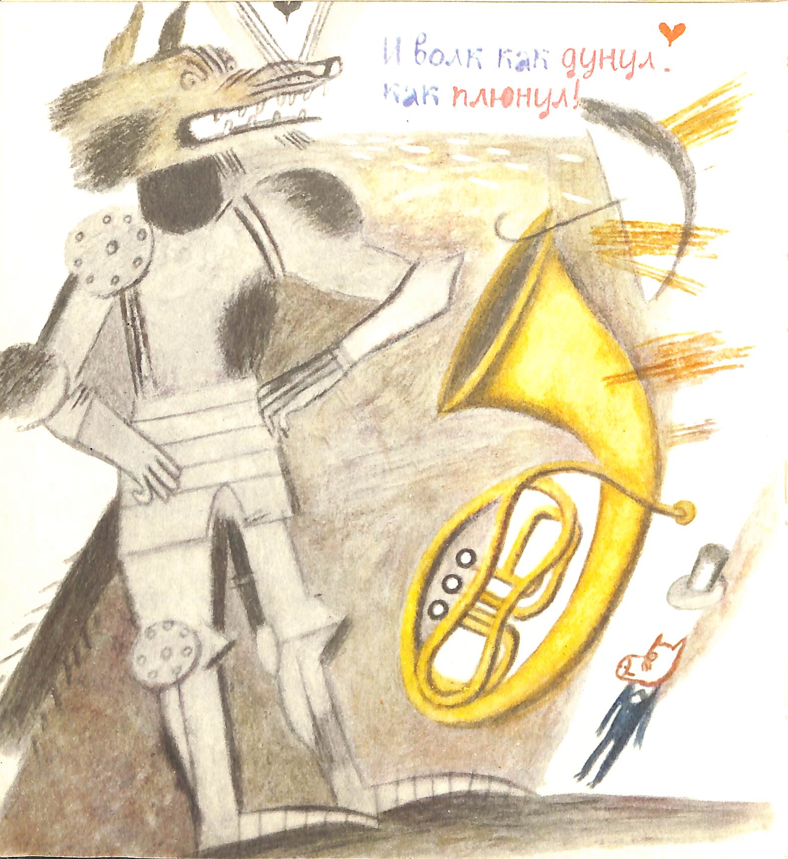 Огромная волторна — то ли трофей (эта волторна присутствовала в сцене, где волк "как дунет, как плюнет" на поросячий домик), то ли сарказм по отношению к советским поросятам, которых, как мы знаем, часто рисовали с сельской дудой.