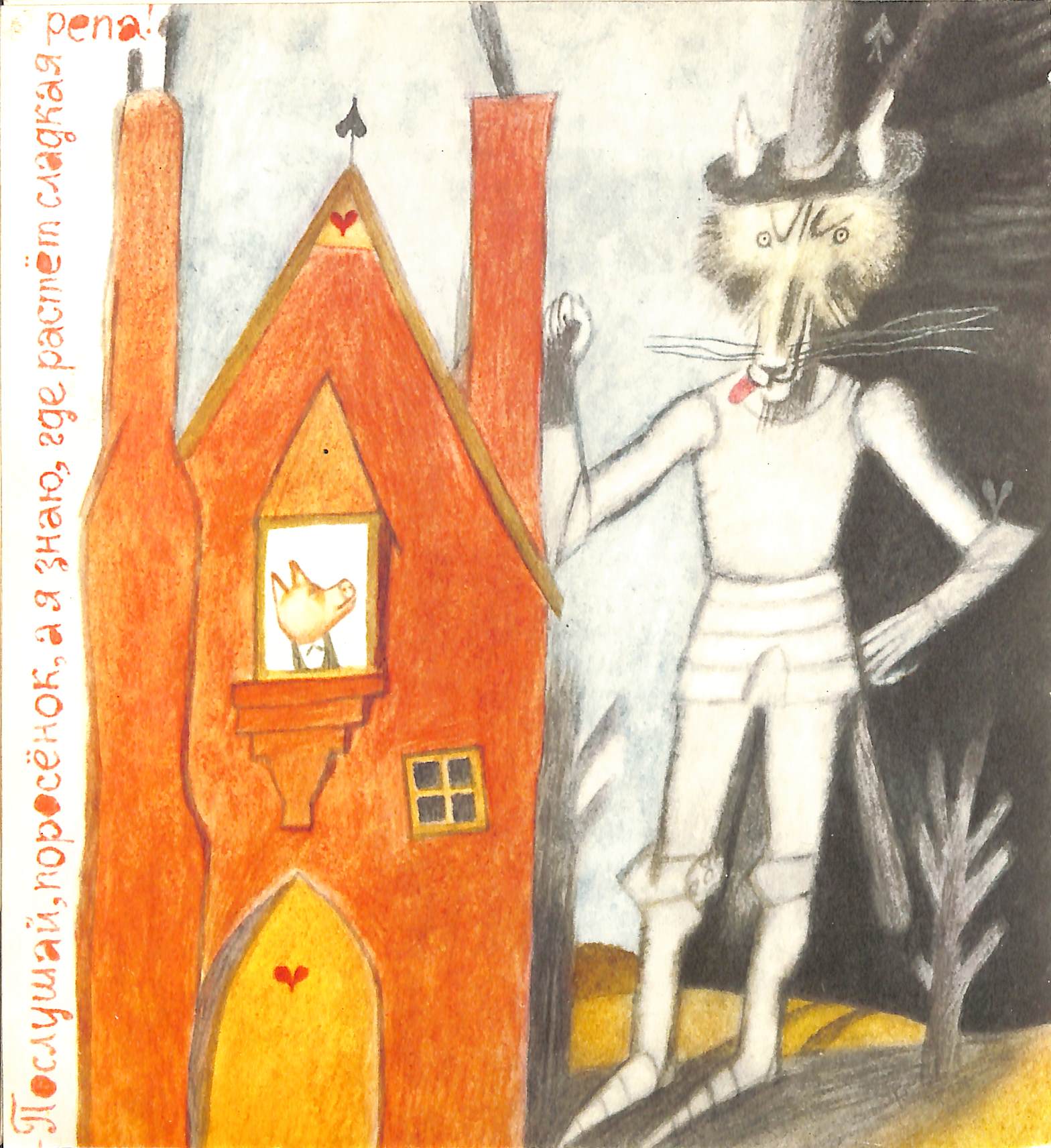 Сделать сюиту иллюстраций именно к английской сказке было суждено Е.Монину. Судя по попыткам других советских художников, Монин должен был всерьёз ломать сложившиеся стереотипы в отношении "Трёх поросят".