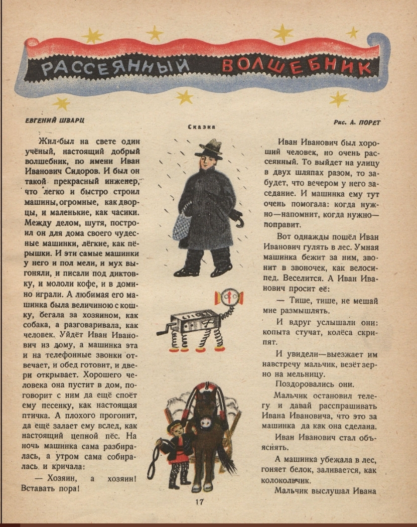 По сравнению с мрачными предвоенным сказками, "Рассеянный волшебник" — это милый анекдот. Лошадь превратили в кошку, а потом обратно в лошадь. Иллюстрации соответствующие.