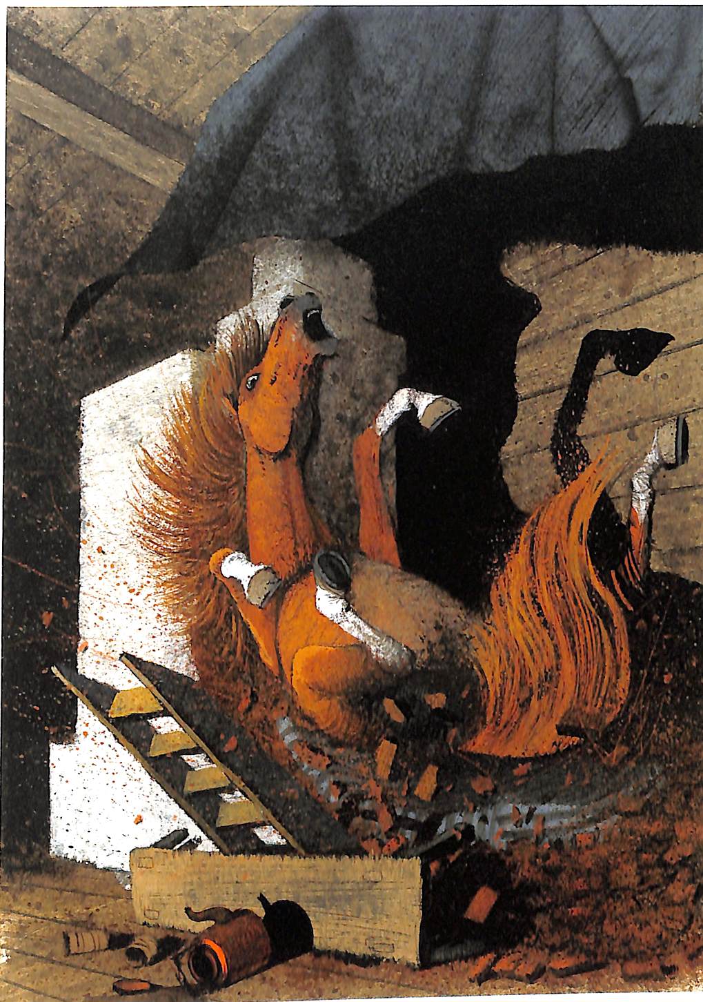 4) А когда через месяц кошка обратно превратилась в лошадь, то у неё остались кошачьи замашки: реветь басом "мяу" и лазить по крышам. Это по-настоящему смешно — Чижиков наконец-то вдохновился текстом Шварца и нарисовал прелестную сочную картинку, в духе своей молодости. Майофис тоже с удовольствием рисует картинки к этой сказке, но сдерживает юмор, интеллигентно понижая его до уровня английского.