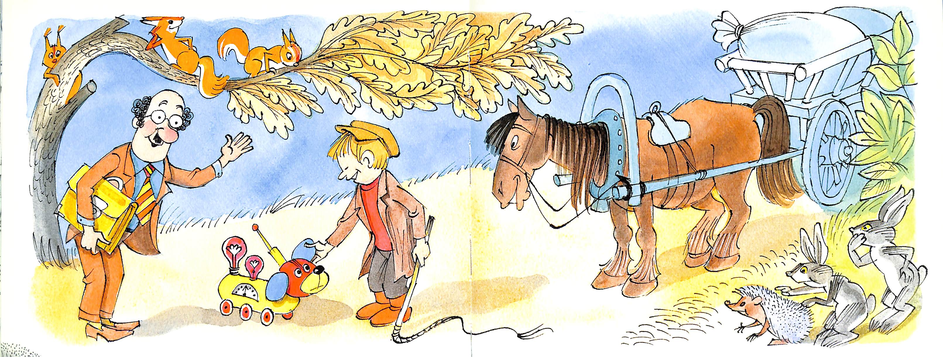 2) Предвидение изобретения собачонки-робота. Встреча волшебника и любопытного мальчугана, управляющего лошадью с телегой.
