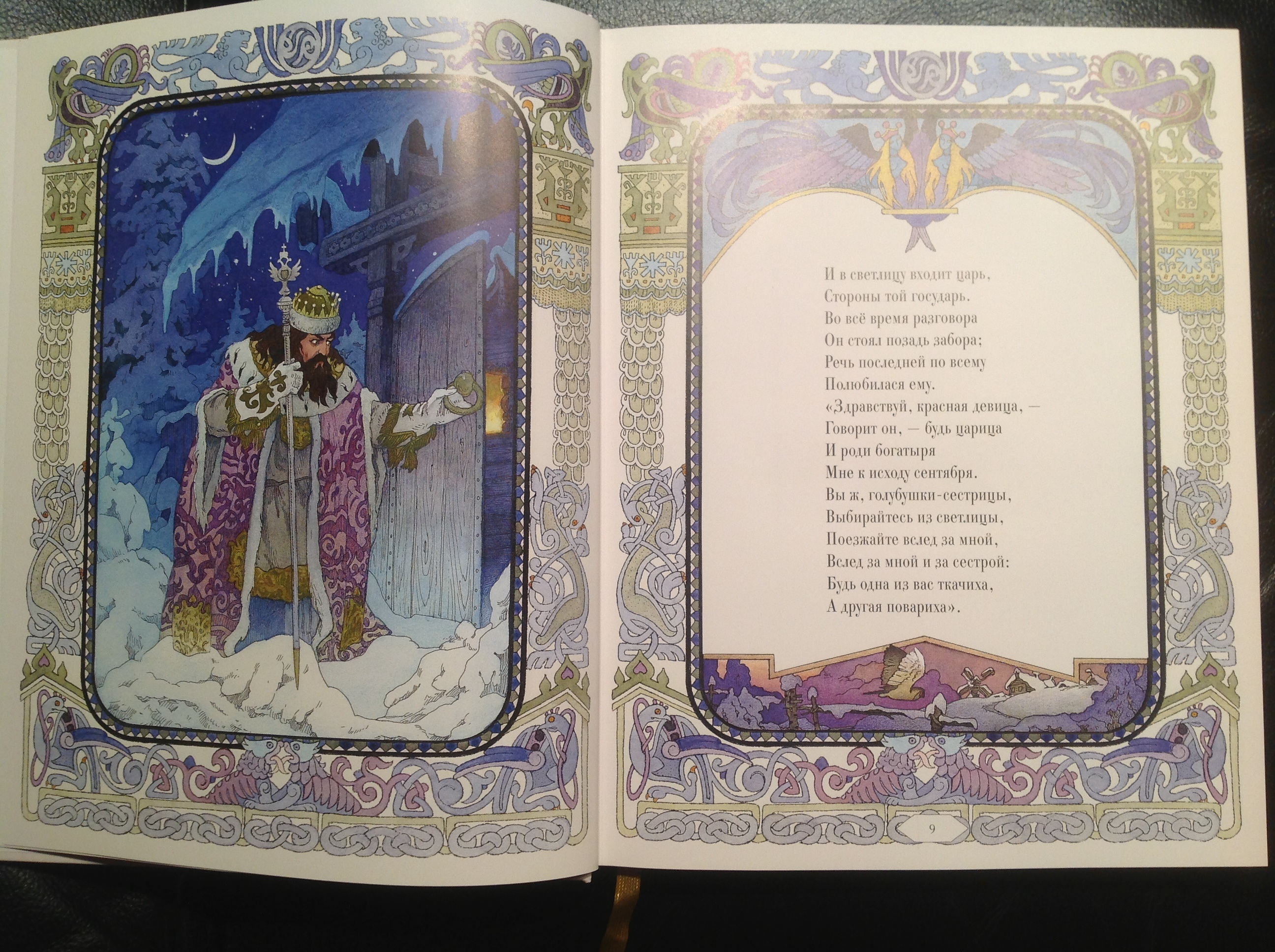 НАЗАРУК В. — декоративное оформление каждой страницы (для каждой сказки — своё), рисованные шмуцтитулы, 101 цв. страничных ил.: Сказка о царе Салтане... — 30 ил.; Сказка о золотом петушке — 13 ил.; Сказка о мертвой царевне и о семи богатырях — 22 ил.; Сказка о рыбаке и рыбке — 14 ил.; Жених — 11 ил.; Сказка о медведихе — 3 ил.; Сказка о попе и работнике его Балде — 8 ил.