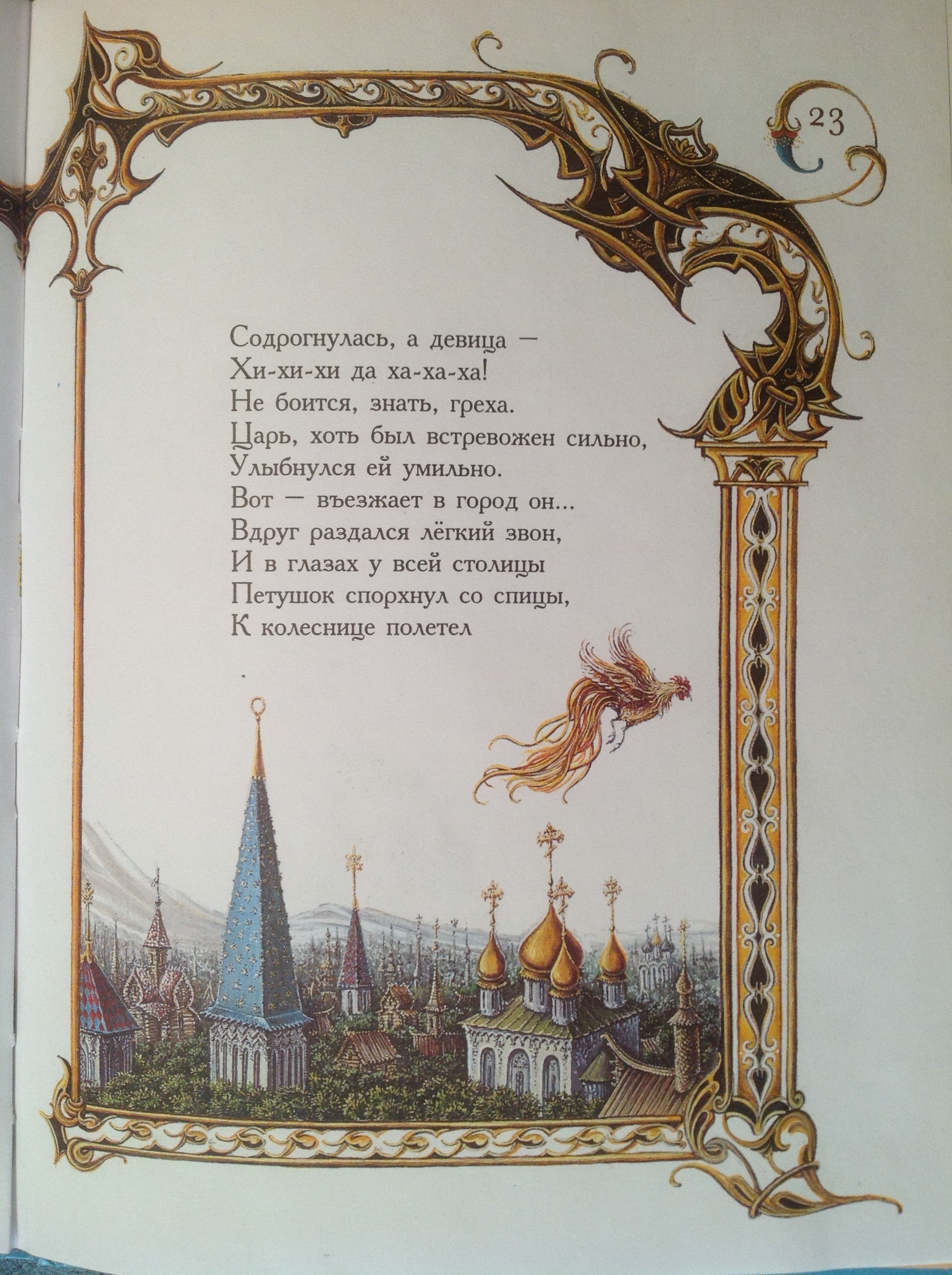 Раздумывал над успехом художника Ковалёва и понял, что помещённая в альбом иллюстрация, действительно, хороша — но с точки зрения композиции: ракурс на пейзаж выбран такой, чтобы почувствовать головокружение от родных просторов. А уже на этом фоне — портрет Золотого петушка.