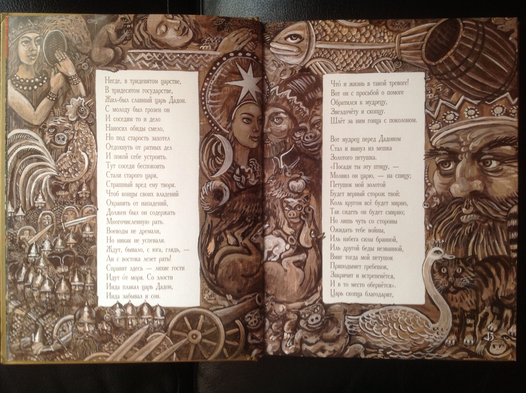 Долго я колебался с покупкой этой книги. Видел её в живую на прилавке, полистал, но сначала не впечатлился — что-то, видать, тогда отвратило от покупки. Потом купил всё-таки для полноты коллекции и при спокойном рассматривании был очарован и пленён (прочувствовал, каково было Дадону под чары попасть). Посмотрим характерные особенности манеры художницы в этом цикле.