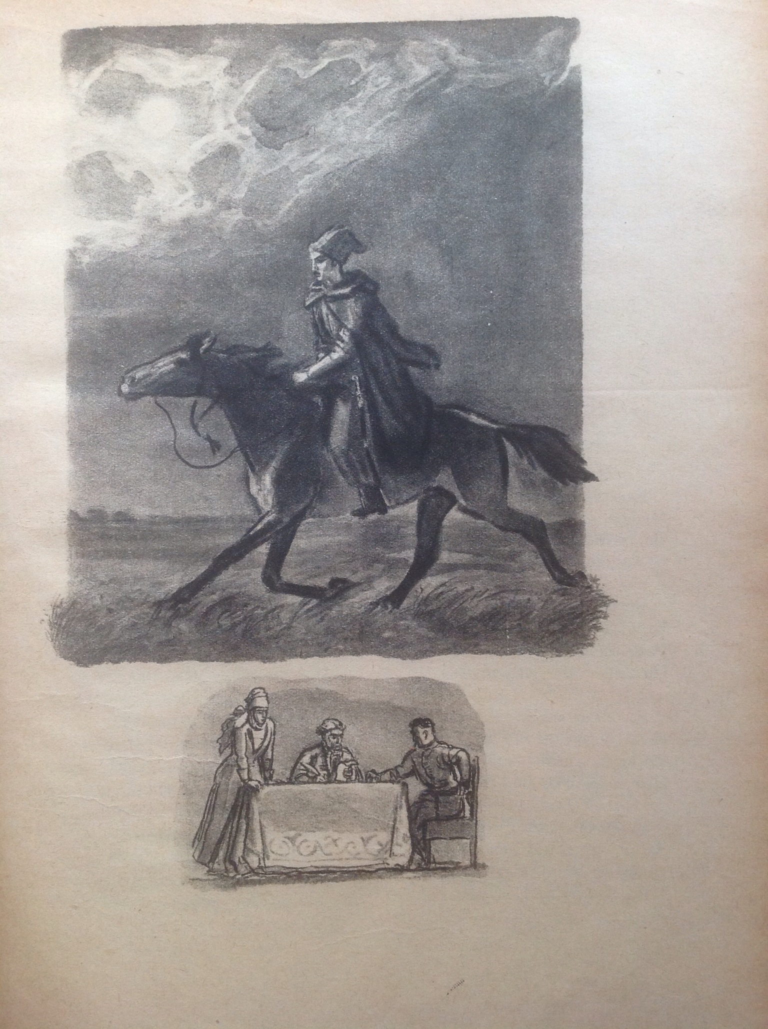 Одна большая иллюстрация Родионова из "Полтавы" был представлена в альбомах, которые мы уже просматривали (https://fantlab.ru/blogarticle60776). Чёрно-белый рисунок, очень традиционная техника. Полную сюиту этого художника я обнаружил пару недель назад как побочный результат поисков другой книги. Продавали на "Алибе" за 50 рублей (+доставка 110 рублей). Почта теперь нормально работает. Как было не купить?