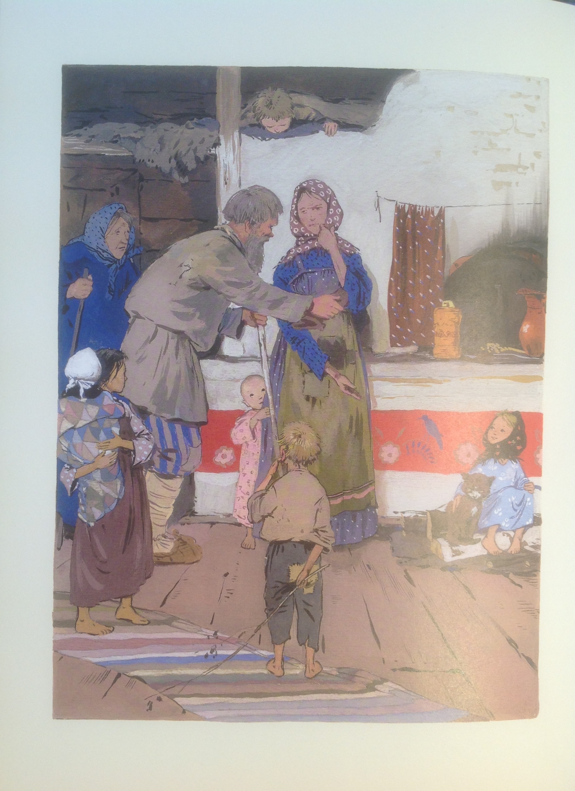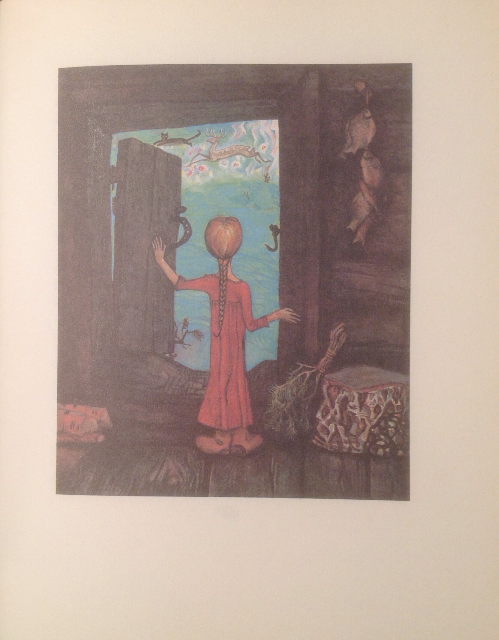 У Мосина есть и полная сюита к "Серебряному копытцу", более ранняя. По формальным причинам покажу её позже. Но для сравнения — аналогичная картинка из полной сюиты. Интересно, как художник вроде всё оставил как было, но на самом деле перерисовал картинку полностью: другая поза у девочки, другой веник, на стене — рыба вместо грибов. Снега другие... Порог интересный — подковообразный. Протёрли дерево?