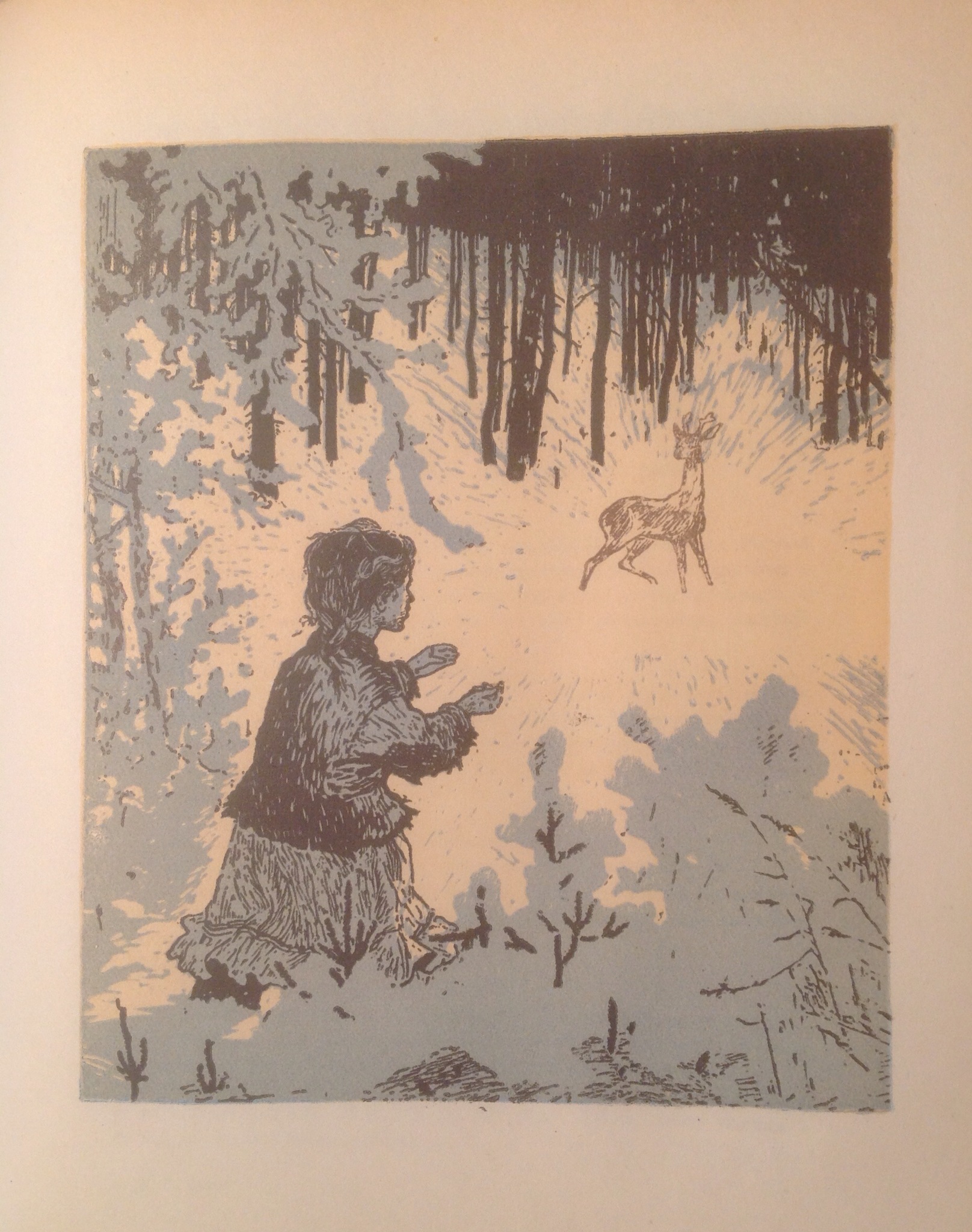 Техника — линогравюра (в аннотации даже указывается, что у художника "оригинальные линогравюры" — надо понимать, сделанные по собственным рисункам). Стандартный набор: к каждому сказу — заставка и страничная иллюстрация. Вот картинки к "Серебряному копытцу". Очень реалистические: Дарёнка к козлику спешит по глубокому снегу.