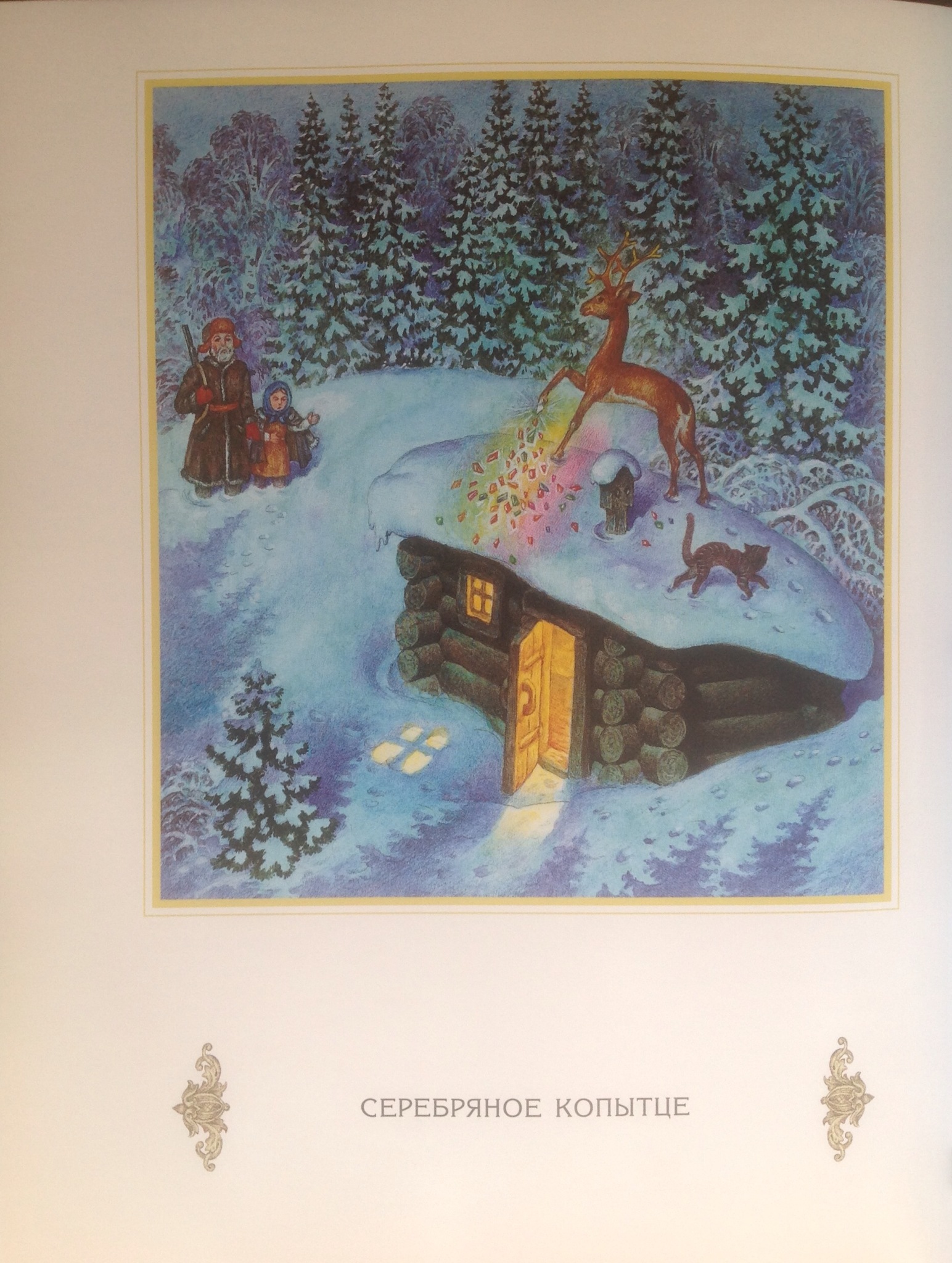 К каждому сказу — по одной цветной страничной иллюстрации. Вот картинка к "Серебряному копытцу".