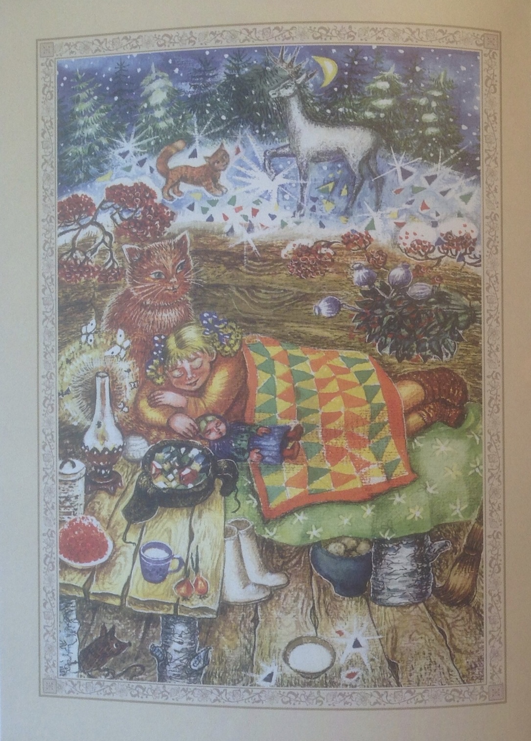 Ну, свежо, современно... Сцена для иллюстрирования выбрана небанальная. Смешение сна и яви — Мурёнка ещё не сбежала, а Дарёнка спит в предверии встречи с козликом (он ей снится), но шапка с самоцветами — уже на столе. И мышка наглая какая-то под столом. Замысел интересный, но картинка — как для детского журнала той поры (т.е. адаптация к неразвитому вкусу). Я вот из-за таких детских иллюстраций не стал брать современные московские издания сказов популярного художника Митрофанова.