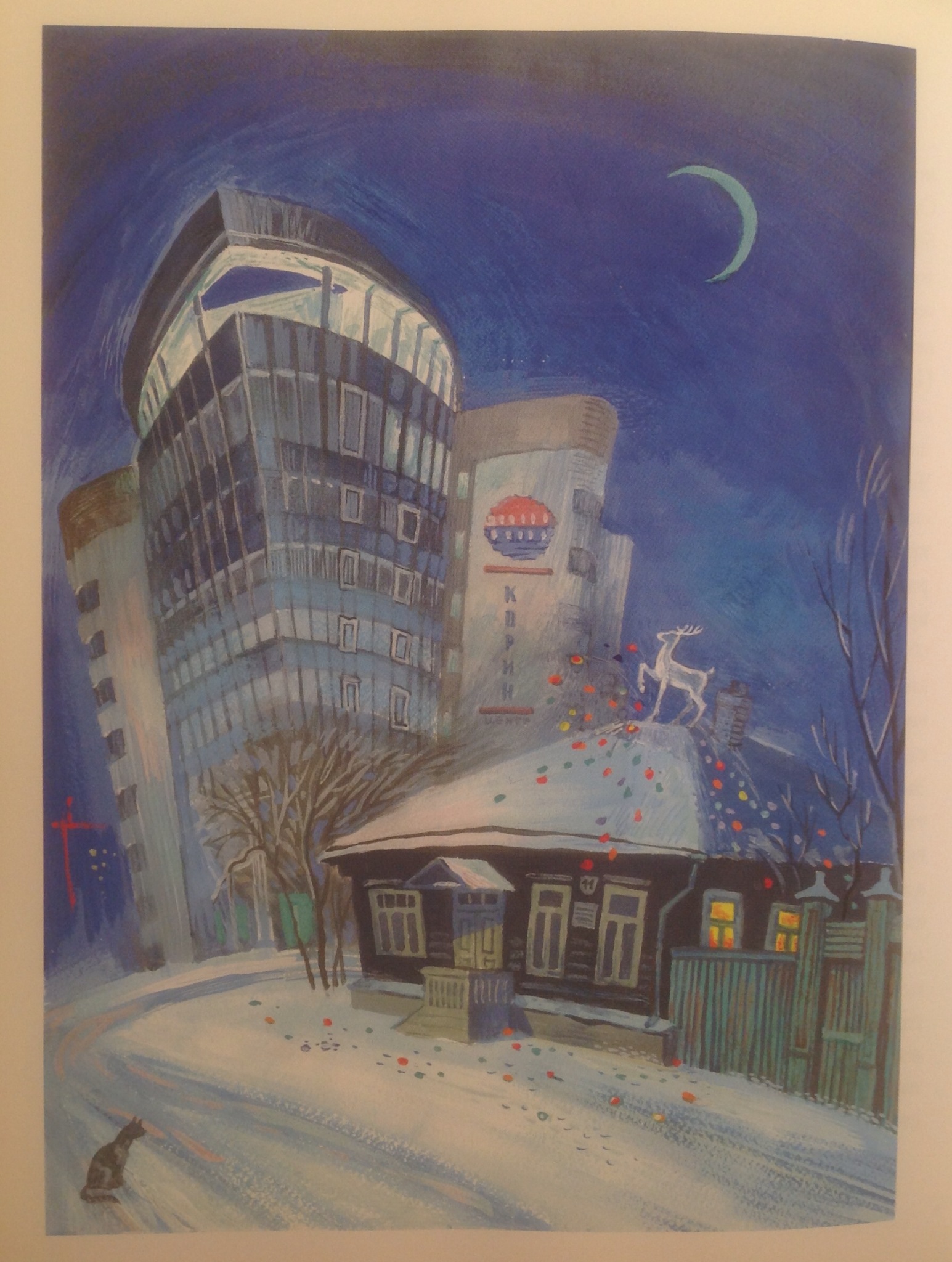 У художника Рыжкова фирменный стиль: старенькие домики Екатеринбурга криво рисовать на фоне современного города. Вот здесь он такой ракурс на дом-музей Бажова выбрал. И Серебряное Копытце на крышу поместил. Пусть будет.