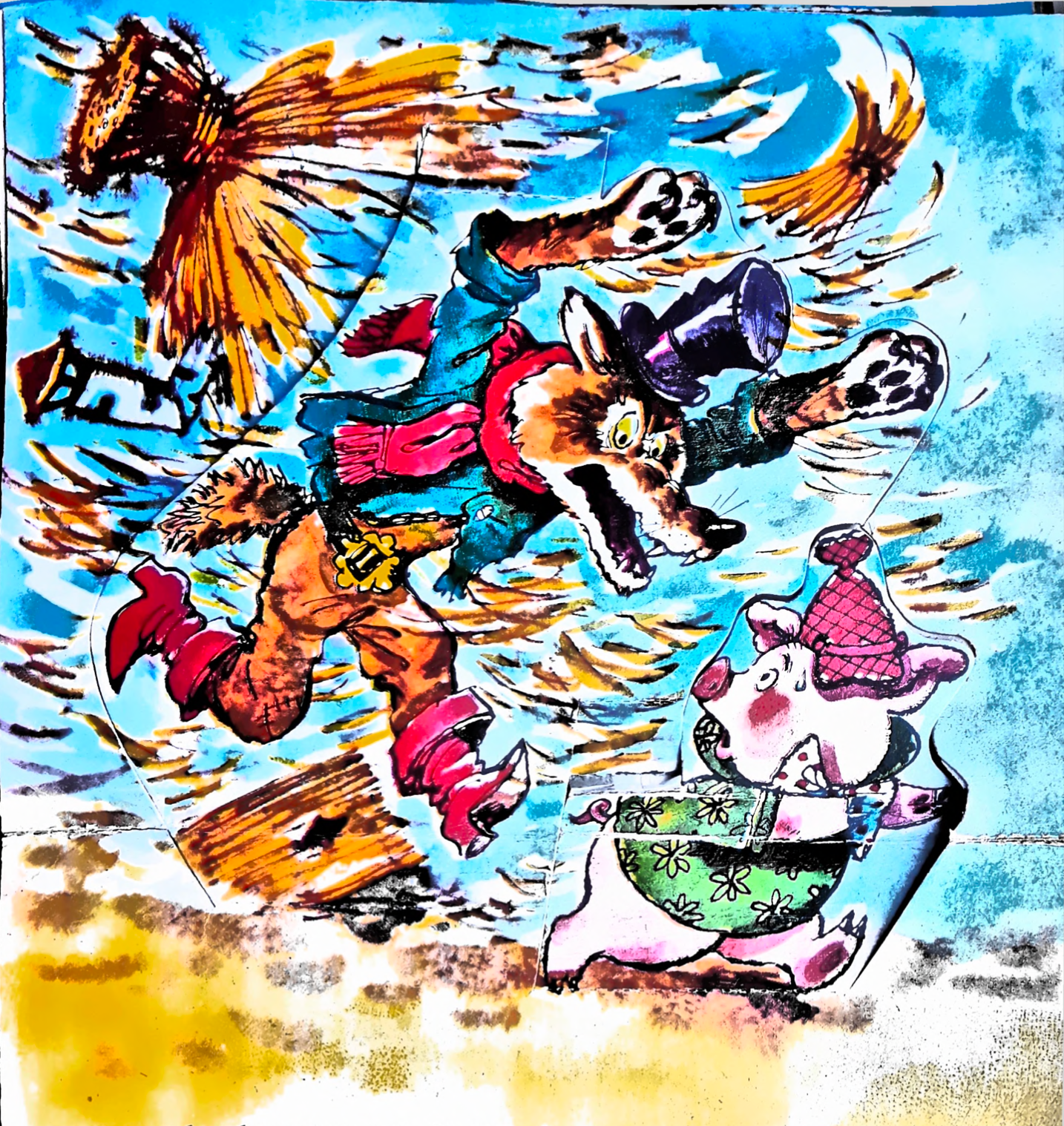 4) А вот и отличия. Степанцев в 1965 году наделяет третьего поросёнка гармошкой — по сравнению с барабаном и горном весьма продвинутый уровень. Савченко в 1978 году, как мы знаем, начиная с обложки, тоже подчеркнул музыкальное мастерство Наф-Нафа, но наделил его гитарой — инструментом бардов.