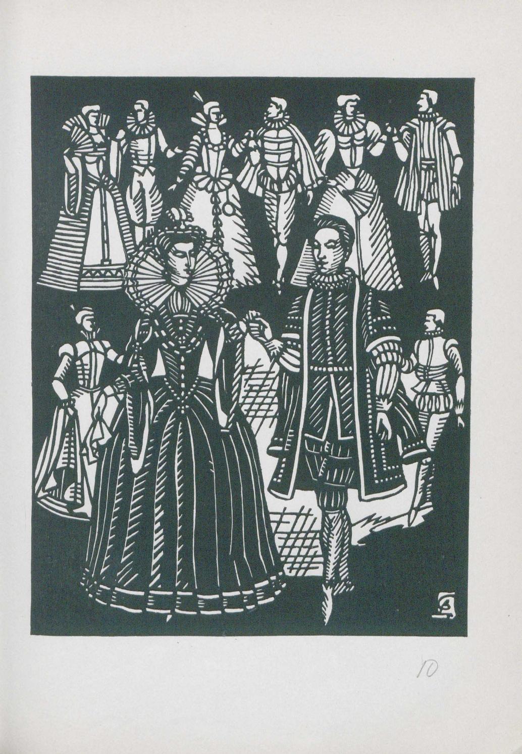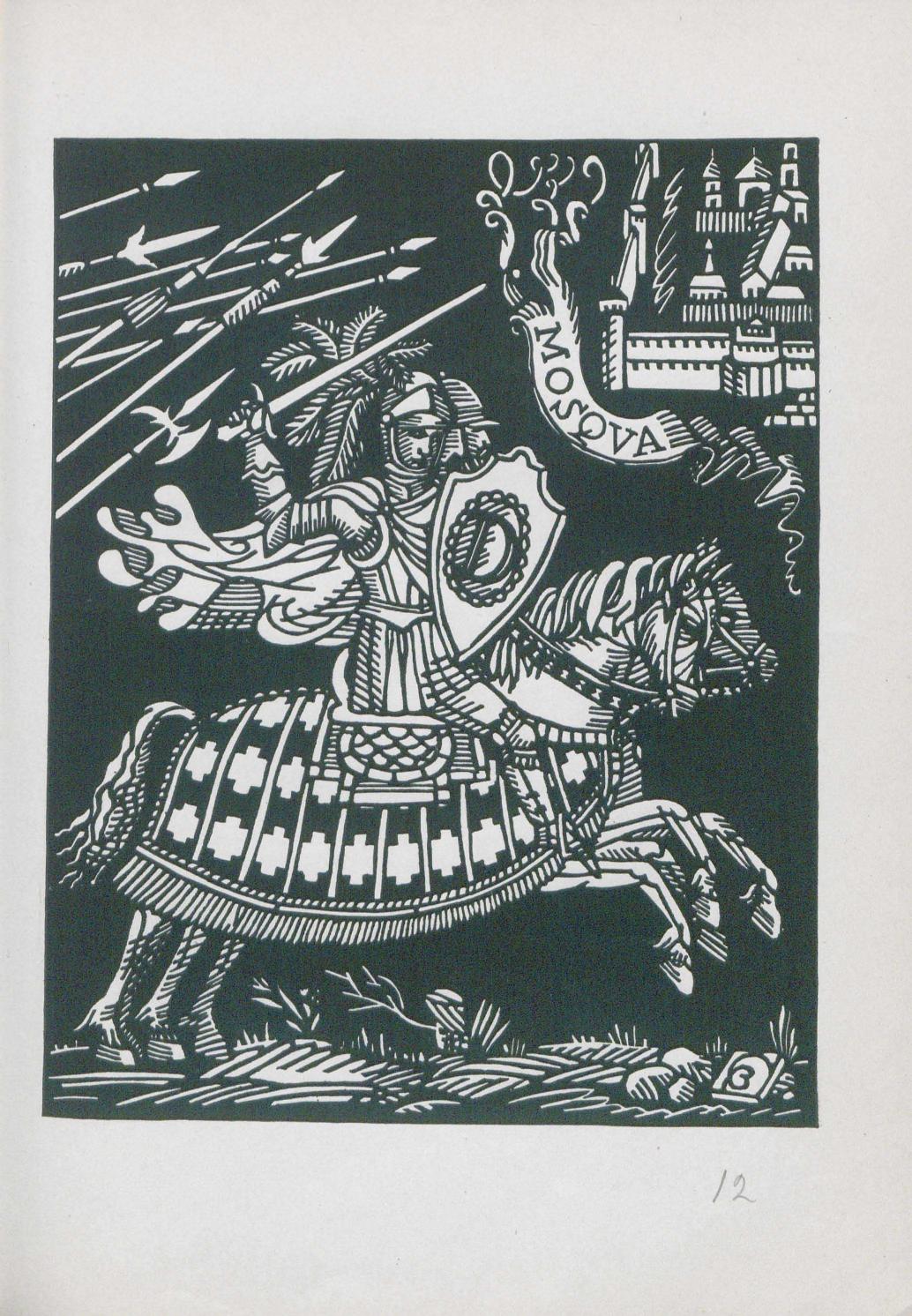 3) Художница А.Якобсон. В 1936 году она сделала иллюстрации к томику "Драмы" в изящной "ленинградской" серии. К каждой пьесе — по одной иллюстрации. К "Борису Годунову" тоже одна. Одна из последних "народных" сцен — Пушкин (предок) с лобного места возвещает о победе царя Димитрия, а народ собирается "вязать борисовых щенков". Общий вид на Кремль, подошло бы к любому историческому рассказу о XVII веке.