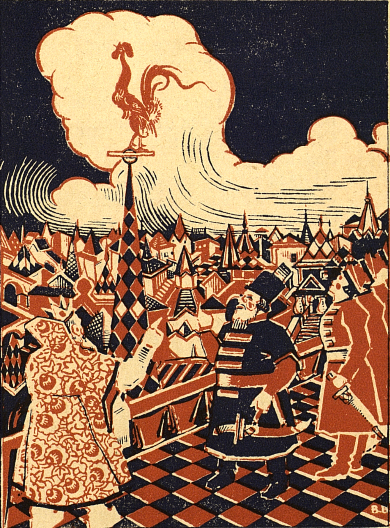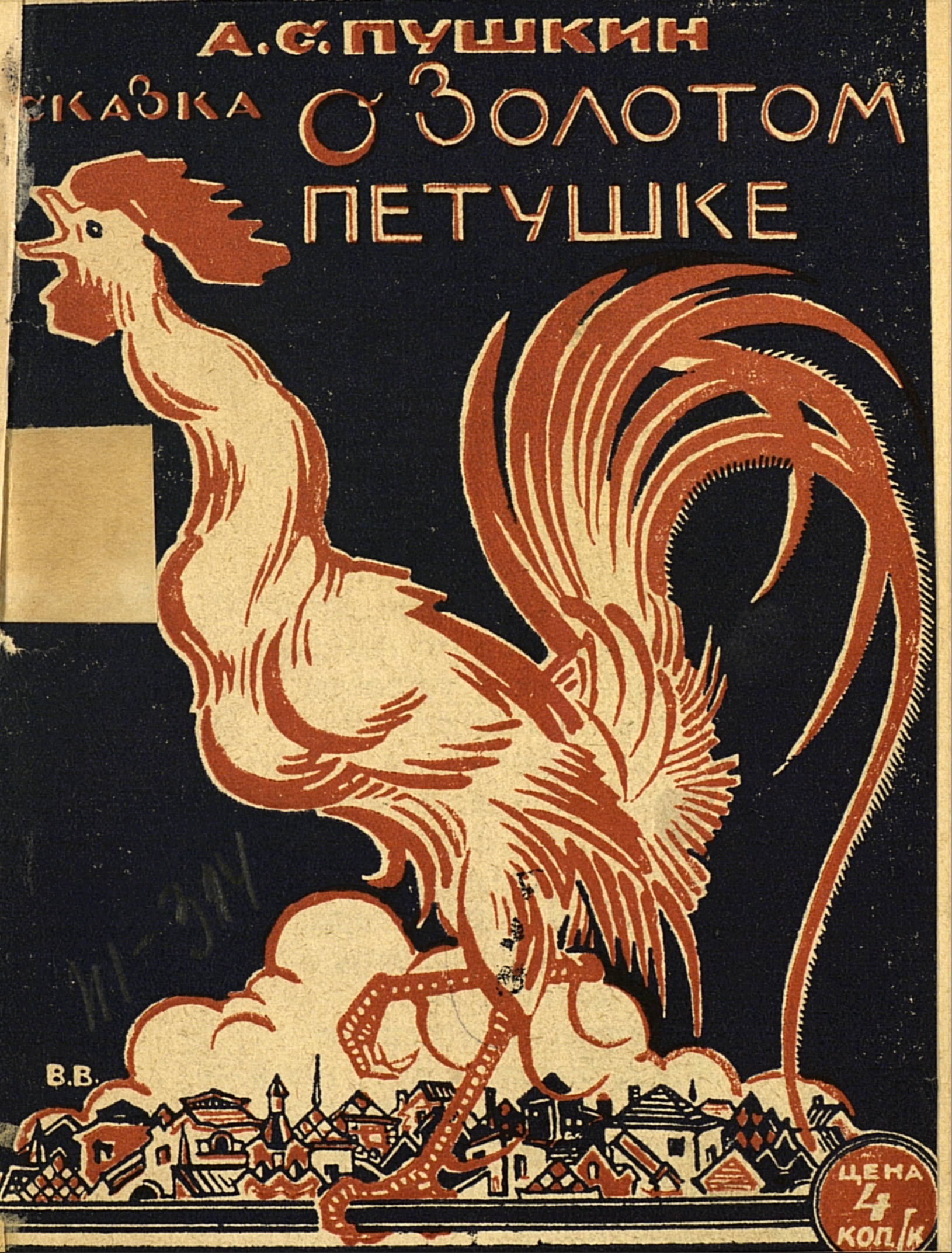 Так что скромное (даже имя художника не выставили) издание "Сказки о золотом петушке" 1927 года вызывает определённый интерес. Рубленные линии, грубый рисунок, две краски — массовое издание.