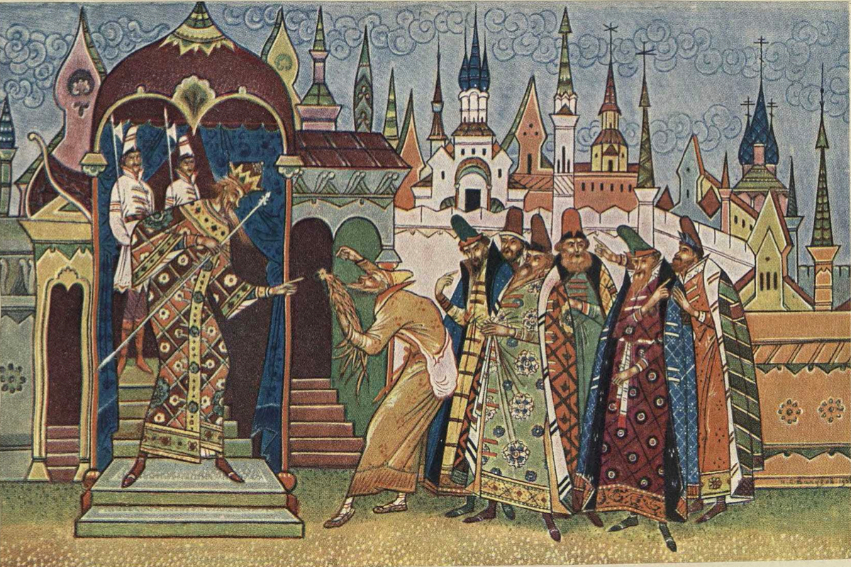 2) Царь Дадон пирует с Шамаханской царицей. Хорошо показан оценивающий взгляд девицы. Дадон — объект манипуляции.