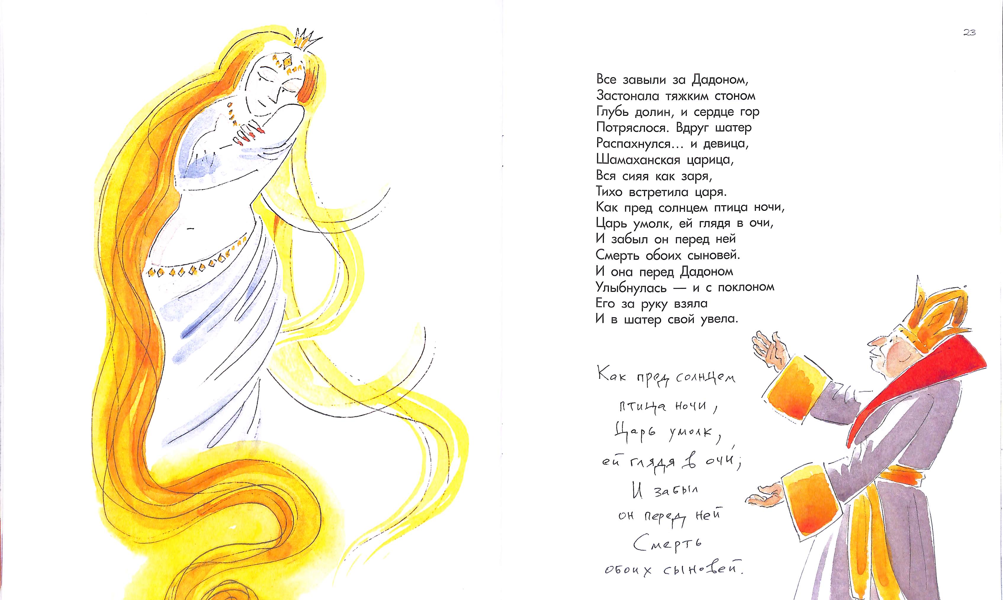 В зрелом возрасте Пушкин сказки писал со всей серьёзностью. Художница тоже ответственно подошла к иллюстрированию "Сказки о золотом петушке": Шамаханская царица всерьёз собралась обольщать престарелого царя.