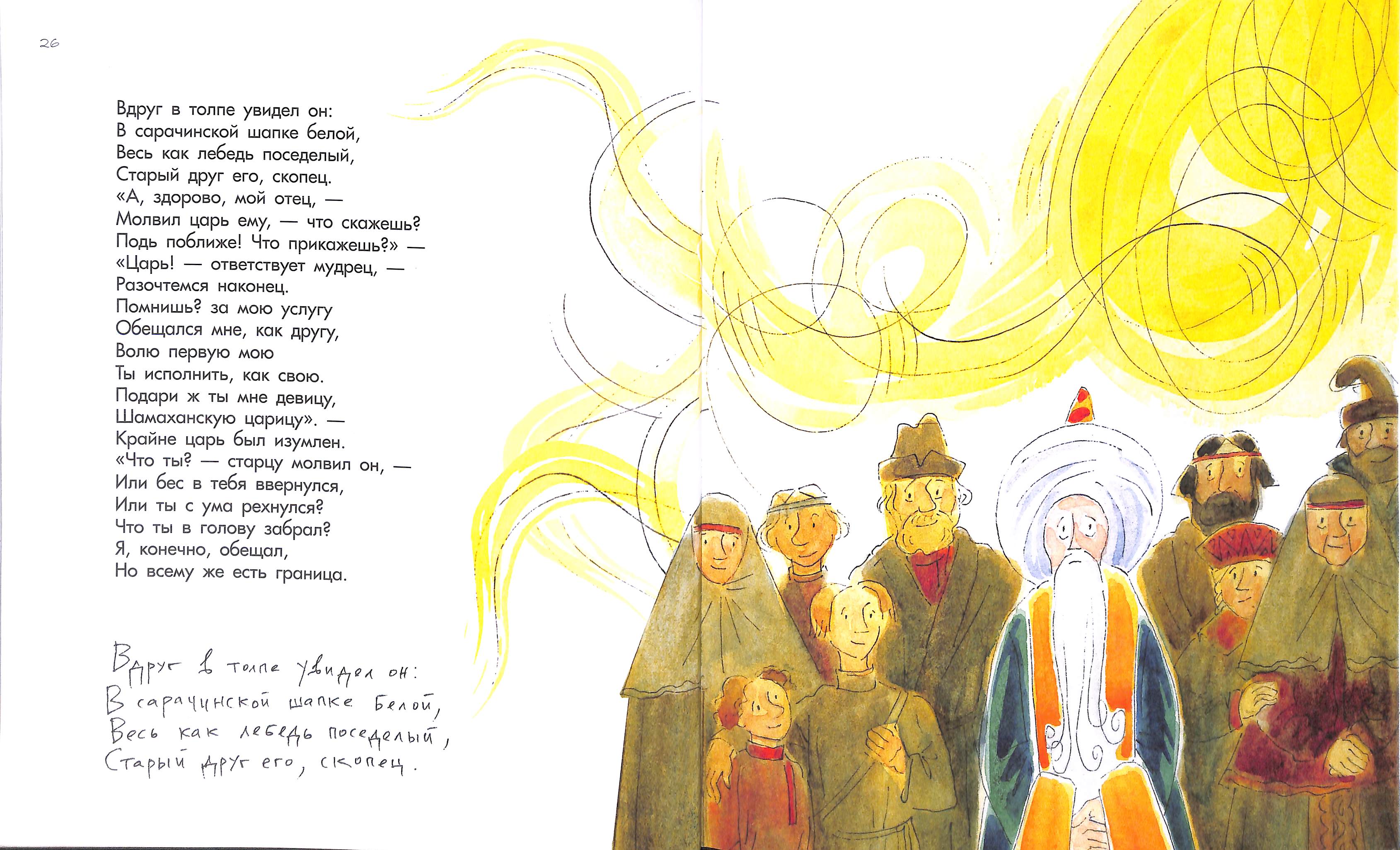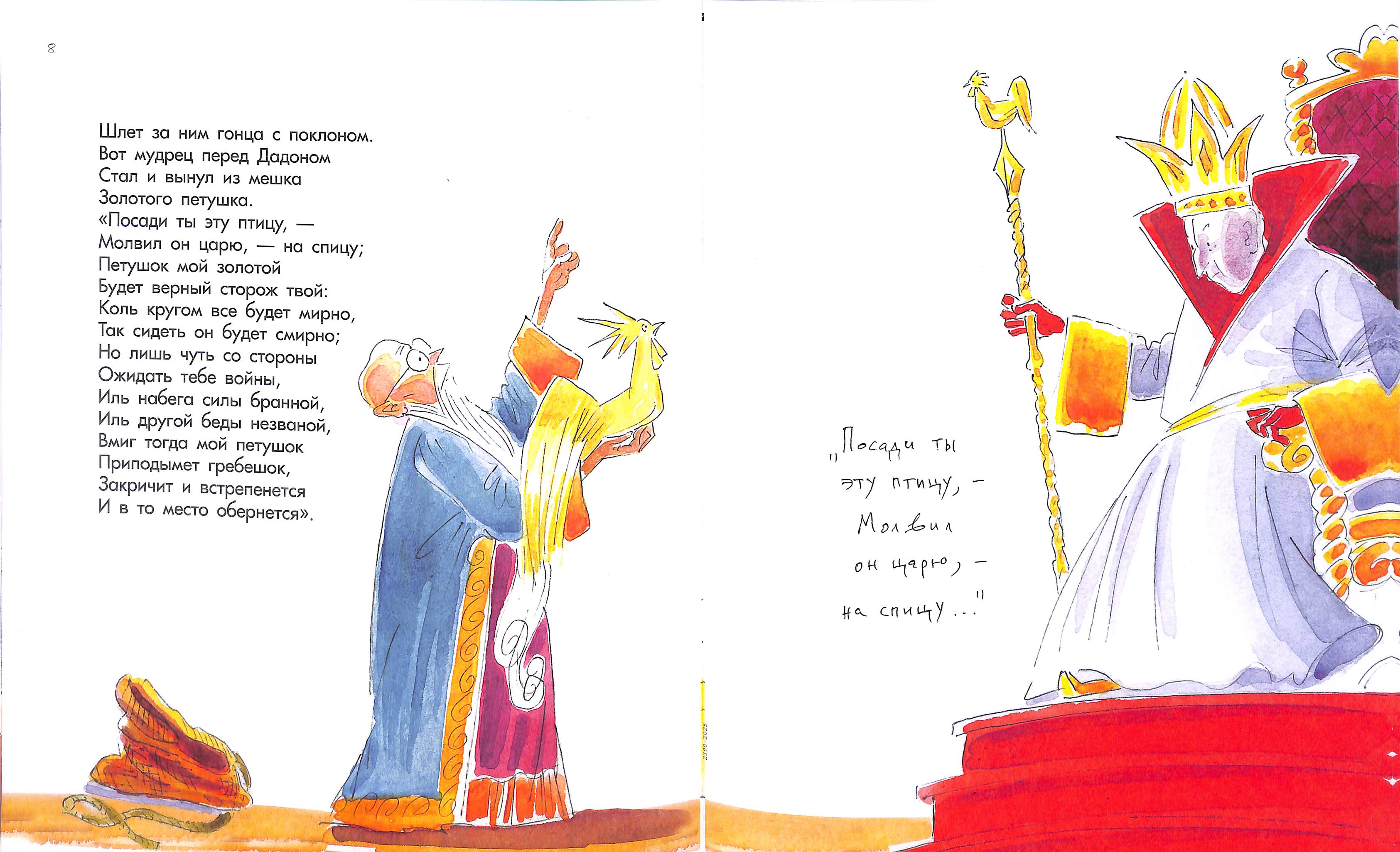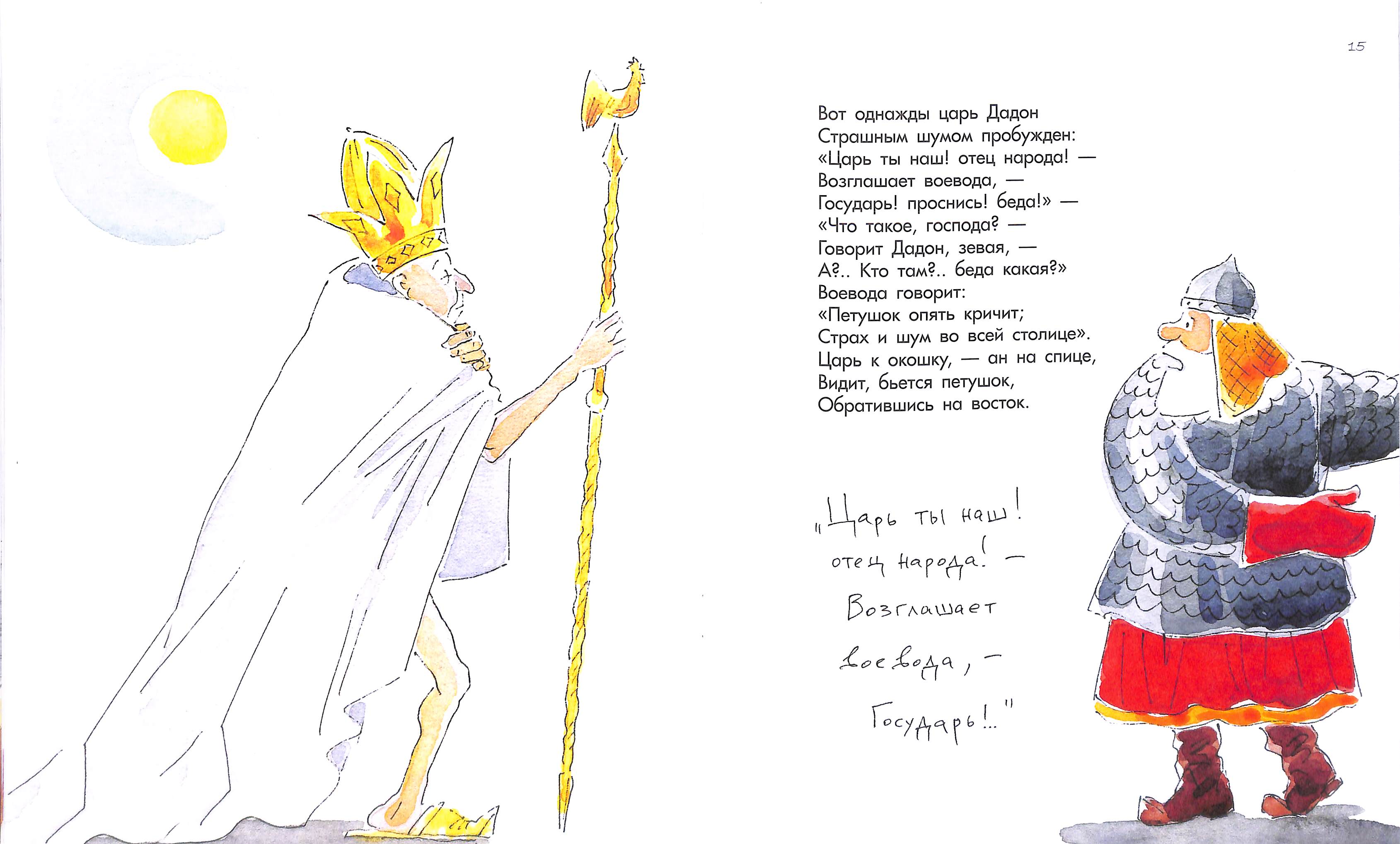 Самобытность сюиты Шаймарданова к пушкинским сказкам проявляется на титульном развороте: там всегда присутствует сам автор. Вот здесь Пушкин беседует с Золотым петушком, пытается выяснить тëмные места в повествовании, мотивы героев, скрытые пружины...