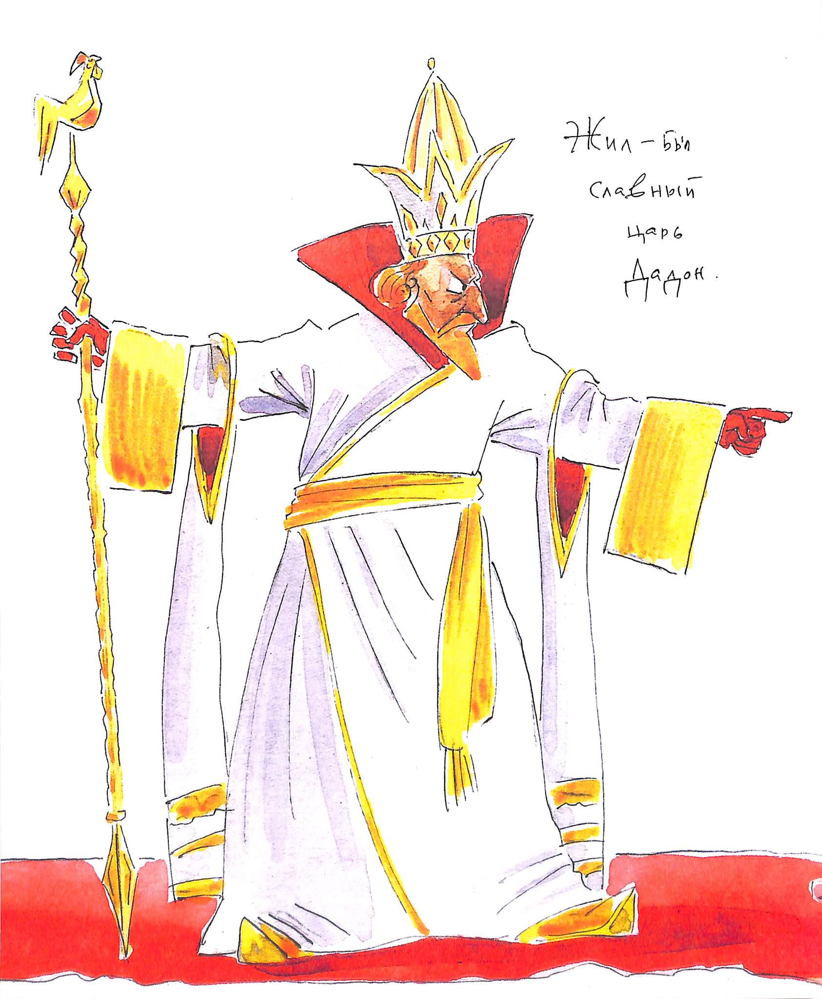 Царя Дадона наши художники изображают в русском допетровском одеянии (как и всех царей в русских сказках). Попыток перенести "Сказку о золотом петушке" на западно-европейскую почву вроде бы не было. Но вот Шаймарданов делает в этом направлении осторожный шаг. У царя Дадона одежды длиннополые, но покрой какой-то не наш и корона смахивает на папскую тиару.